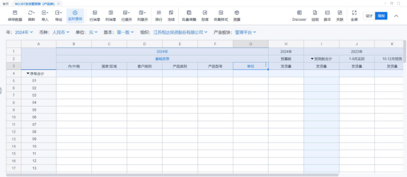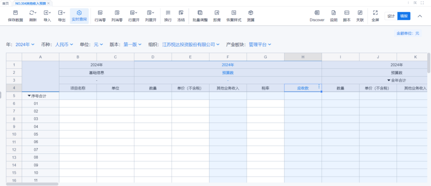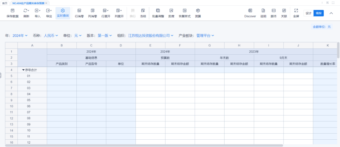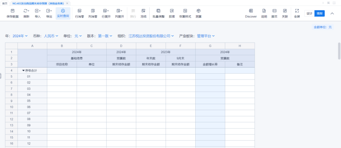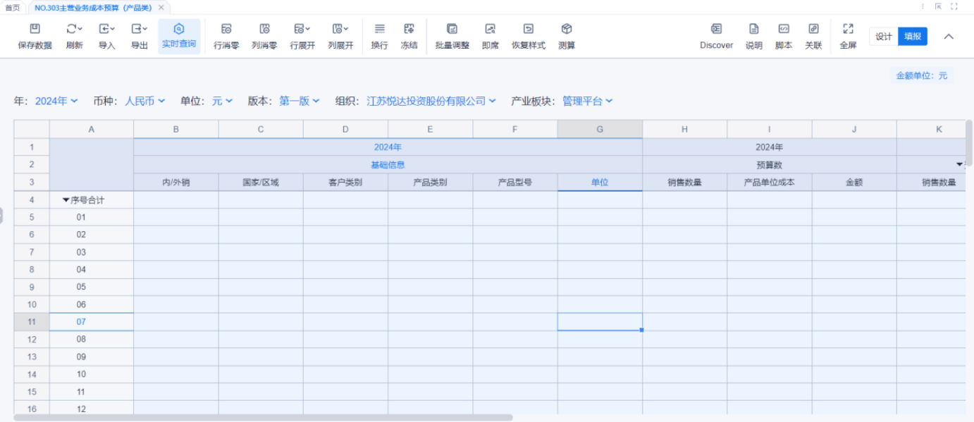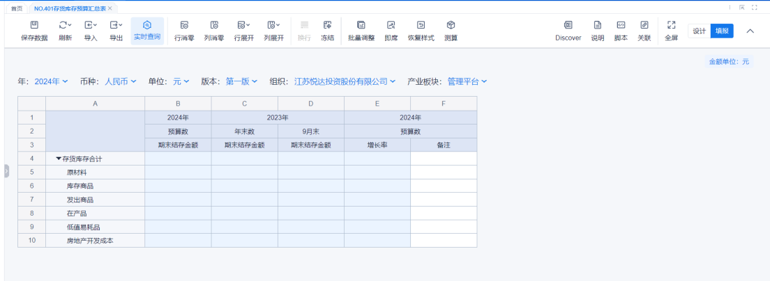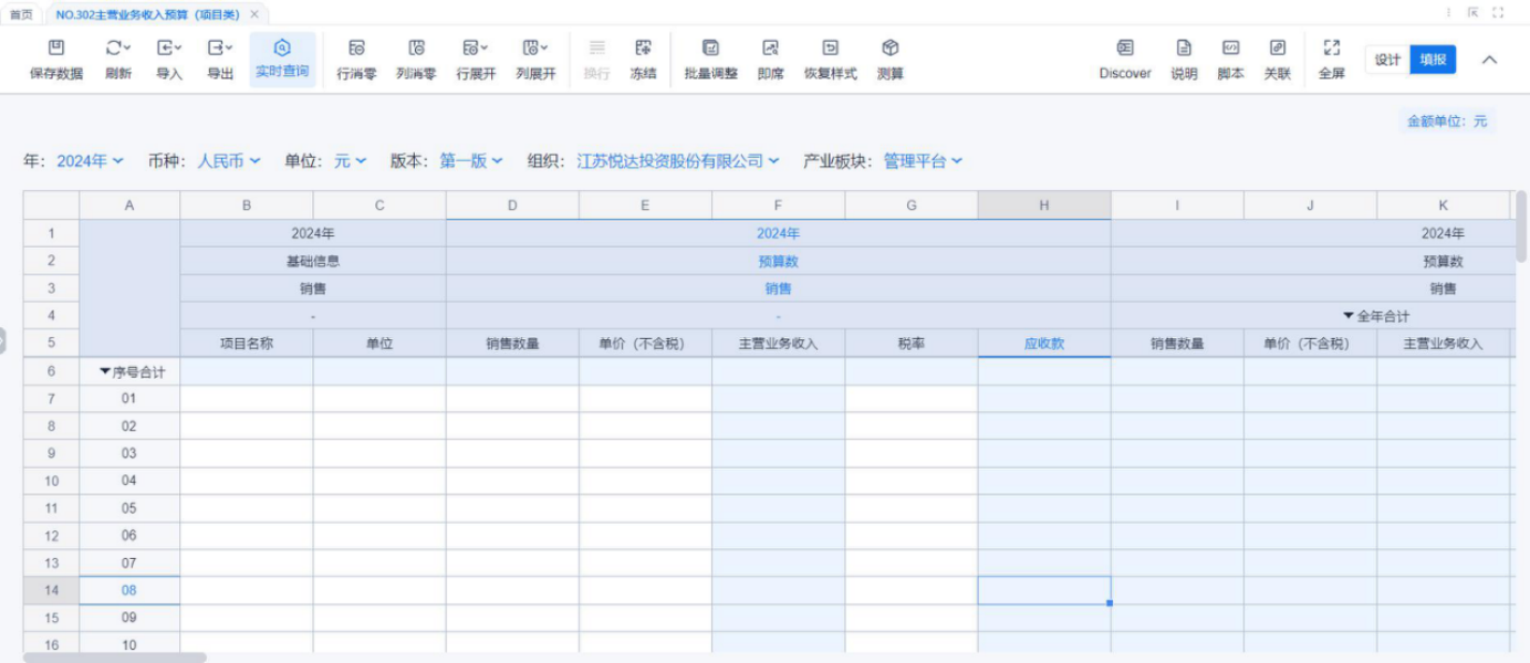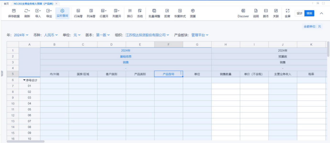 1、本表分产品类/项目类/房地产类/金融类展示年度预算模块的基础信息以及预算数,取自《主营业务收入预算》