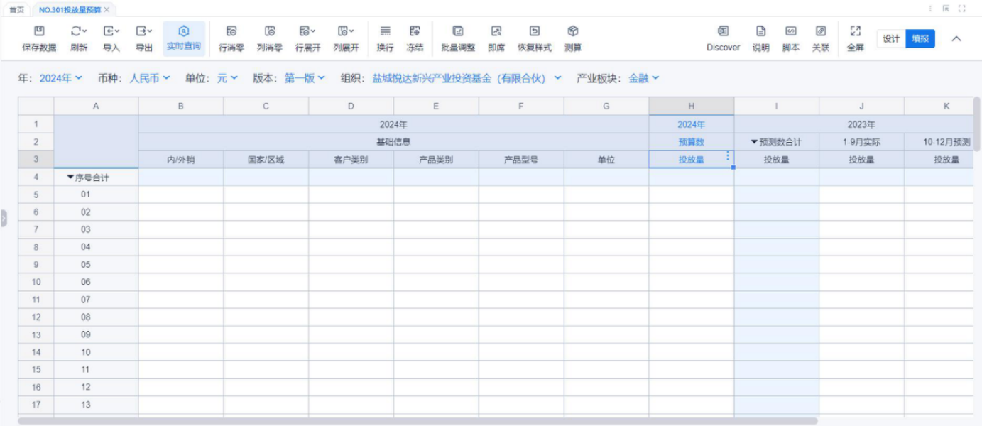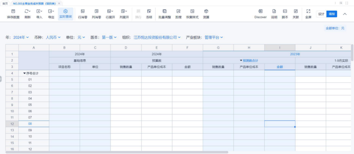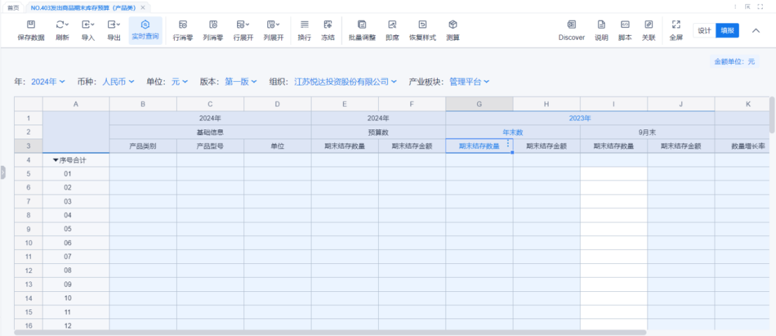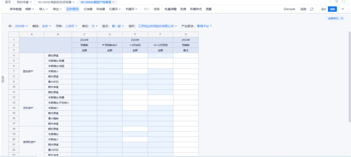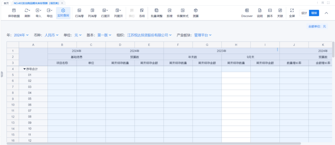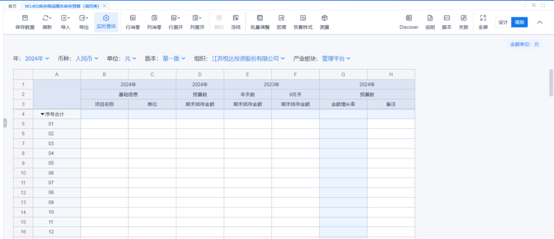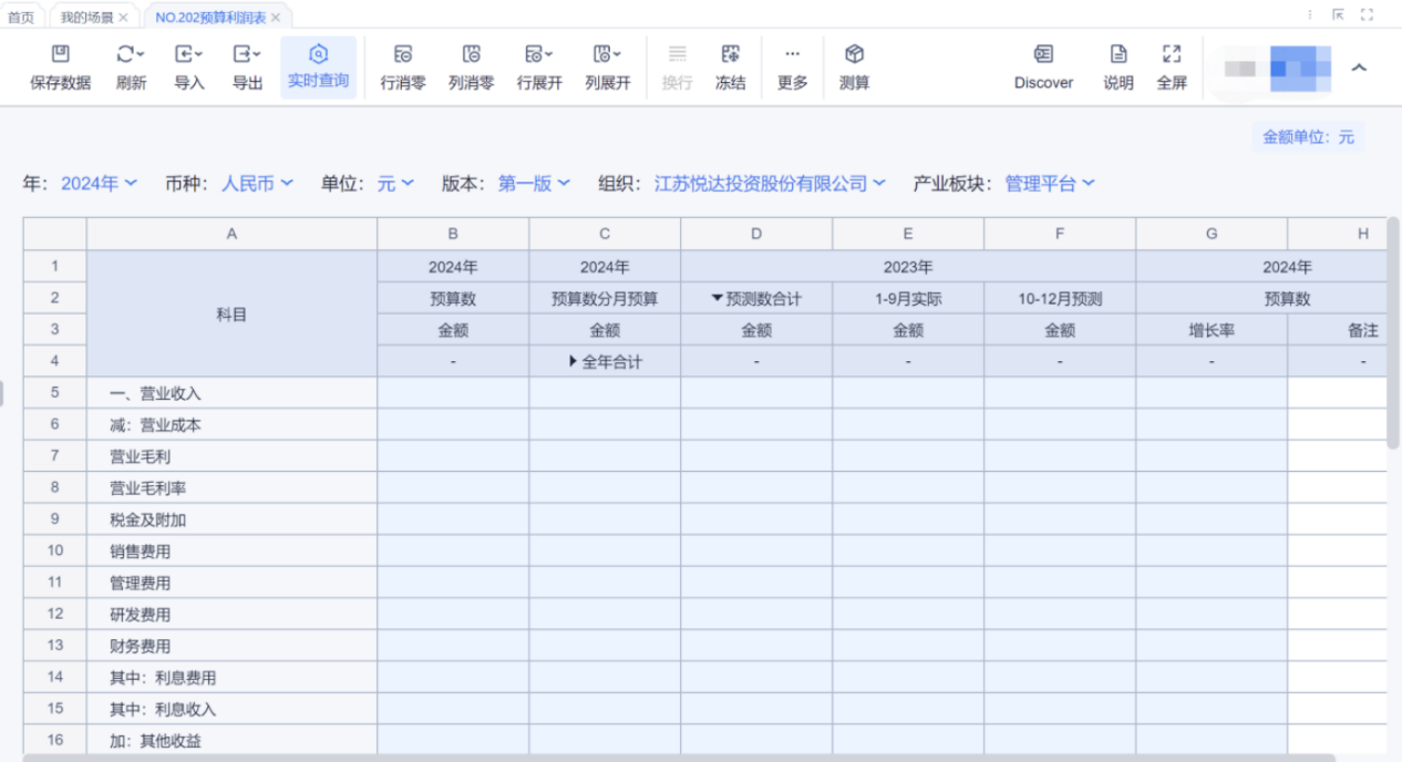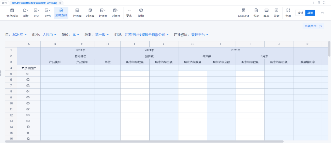1、本表分产品类/项目类/房地产类/金融类展示年度预算模块的基础信息以及预算数,取自《主营业务收入预算》
