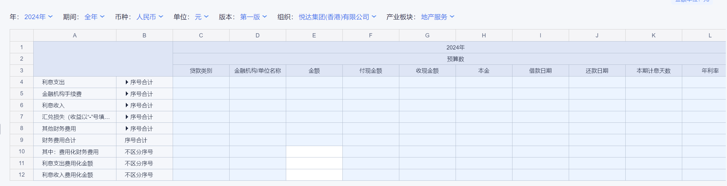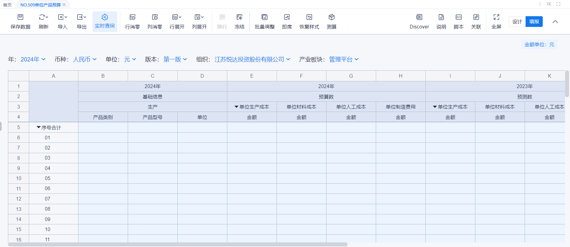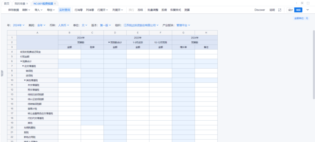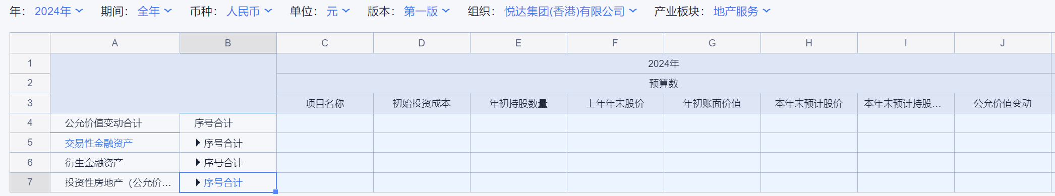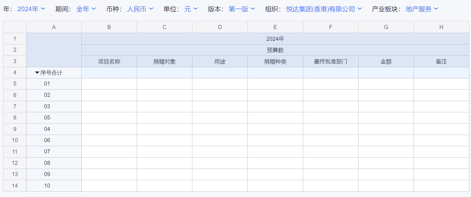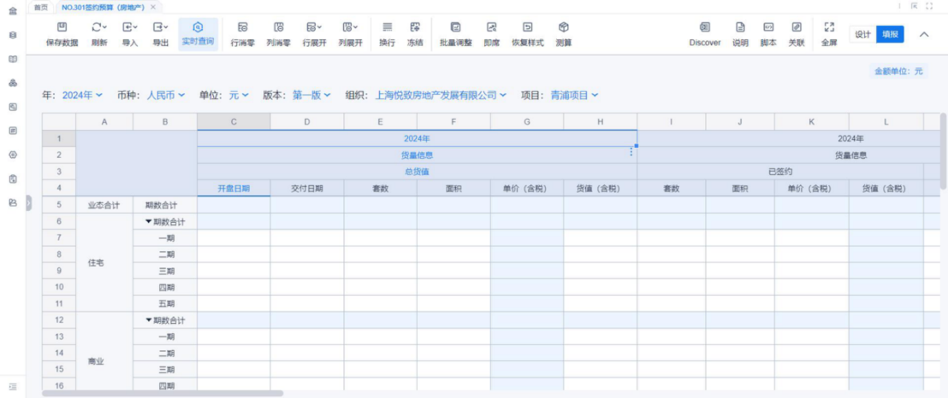 1、本表分产品类/项目类/房地产类/金融类展示年度预算模块的基础信息以及预算数,取自《主营业务收入预算》