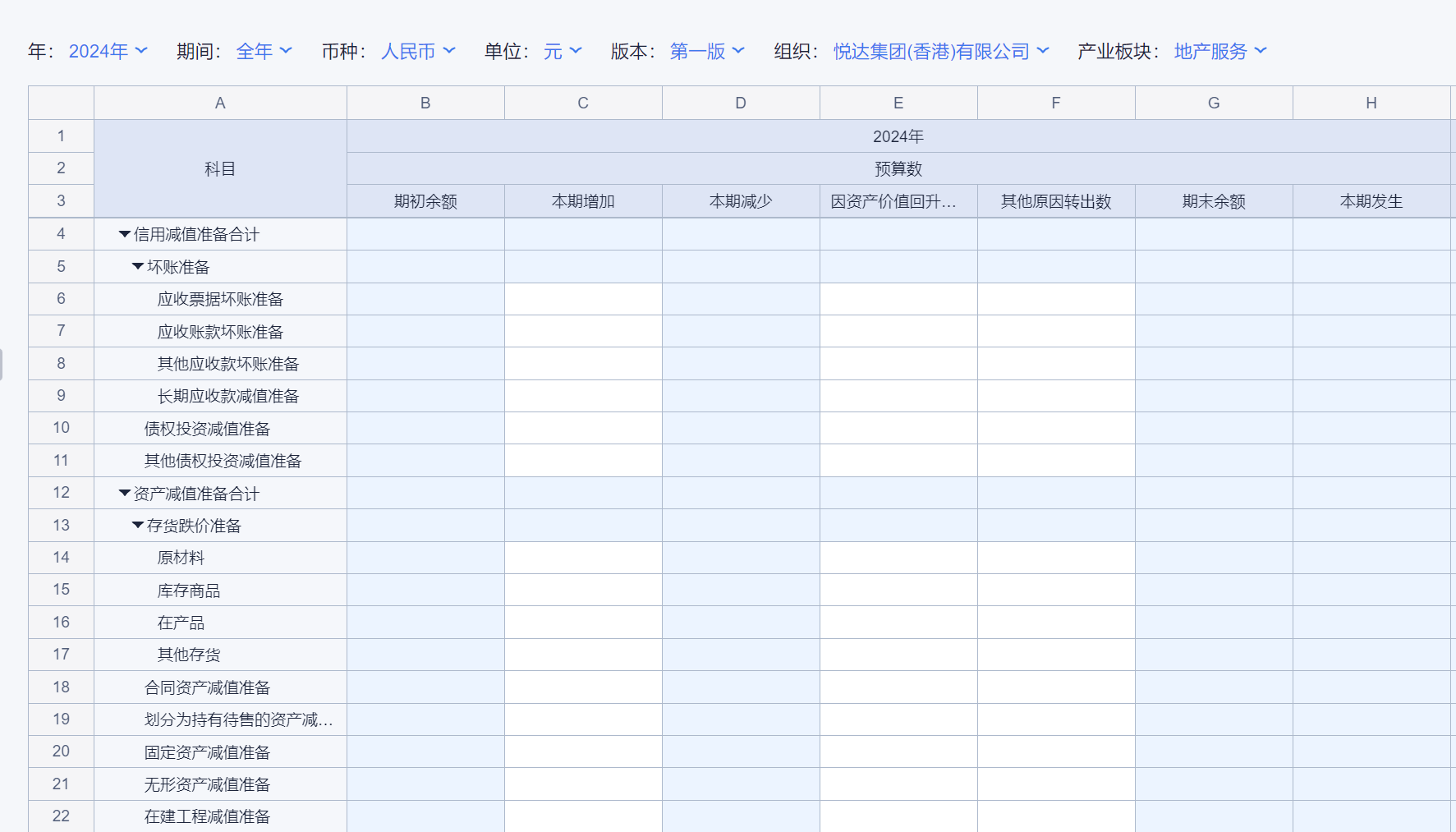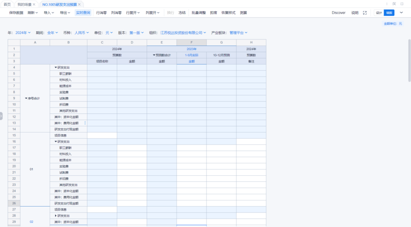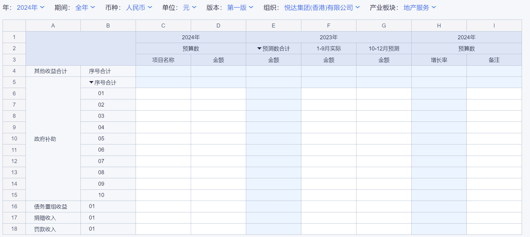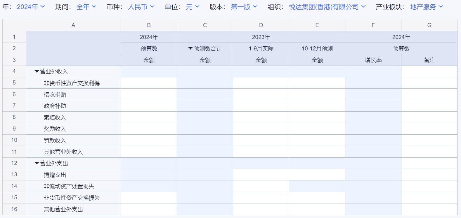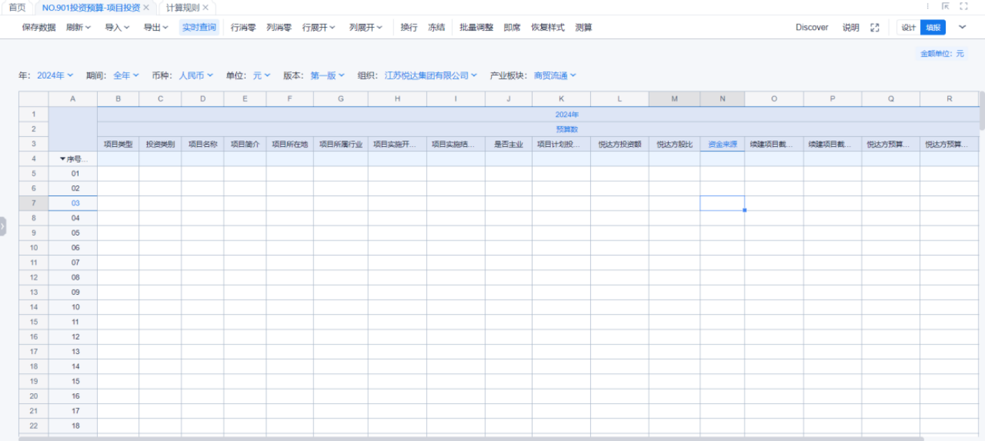 1、本表分产品类/项目类/房地产类/金融类展示年度预算模块的基础信息以及预算数,取自《主营业务收入预算》
