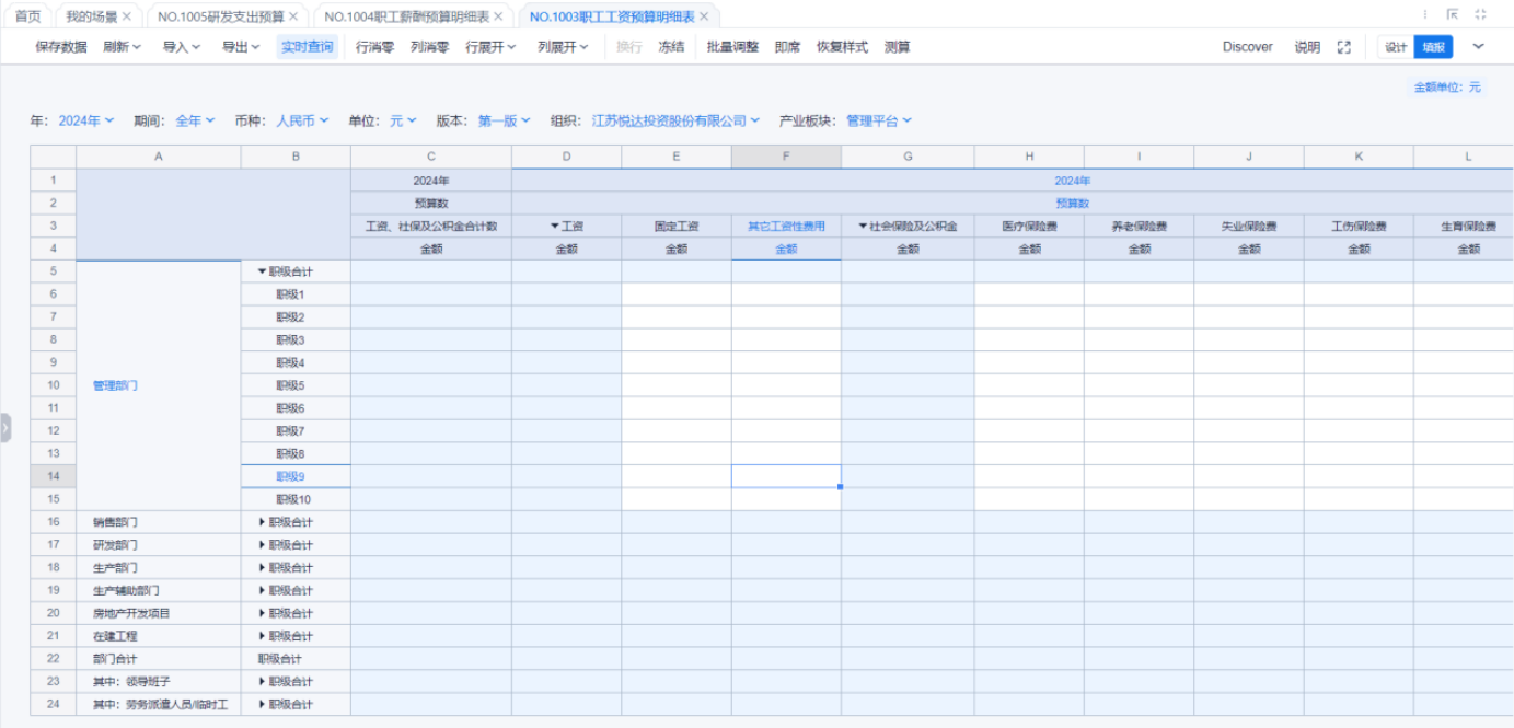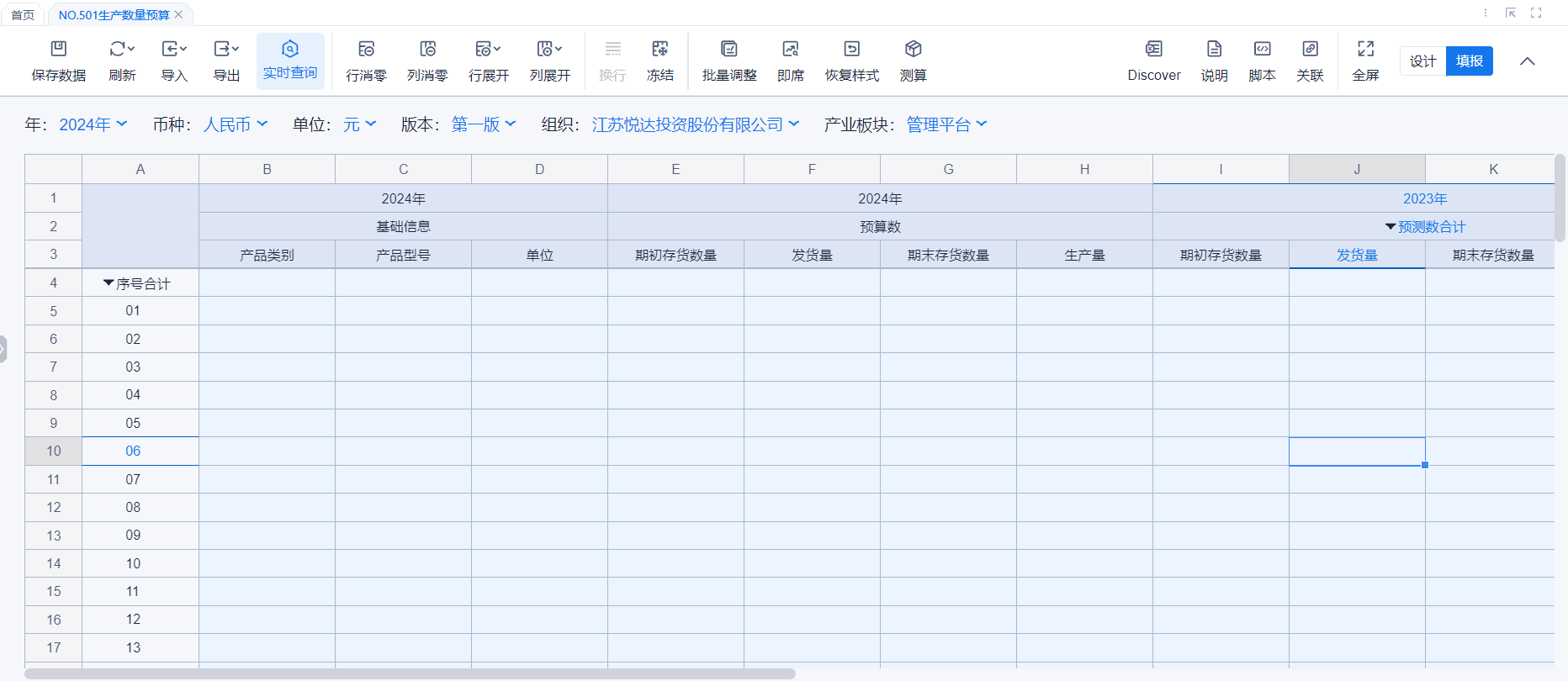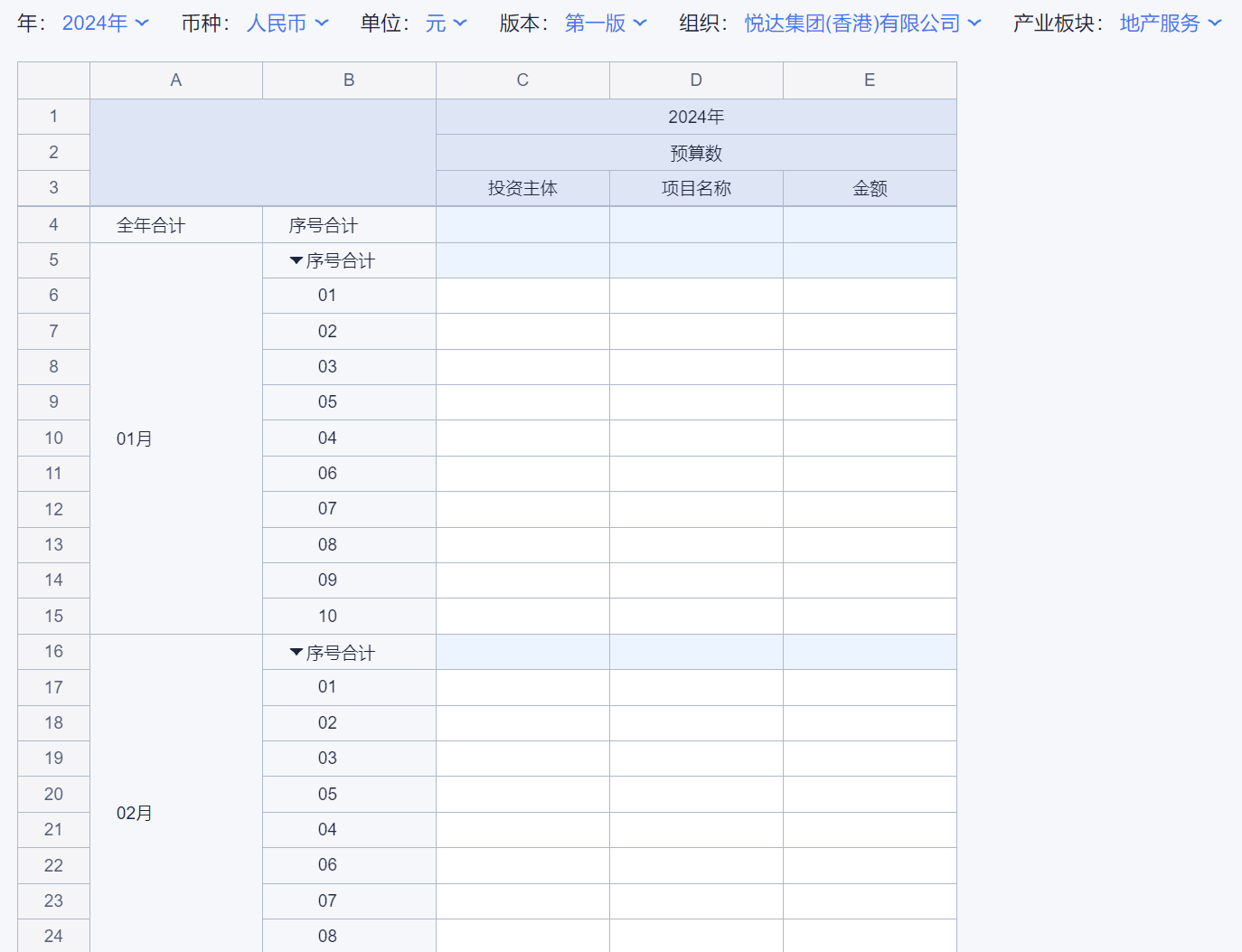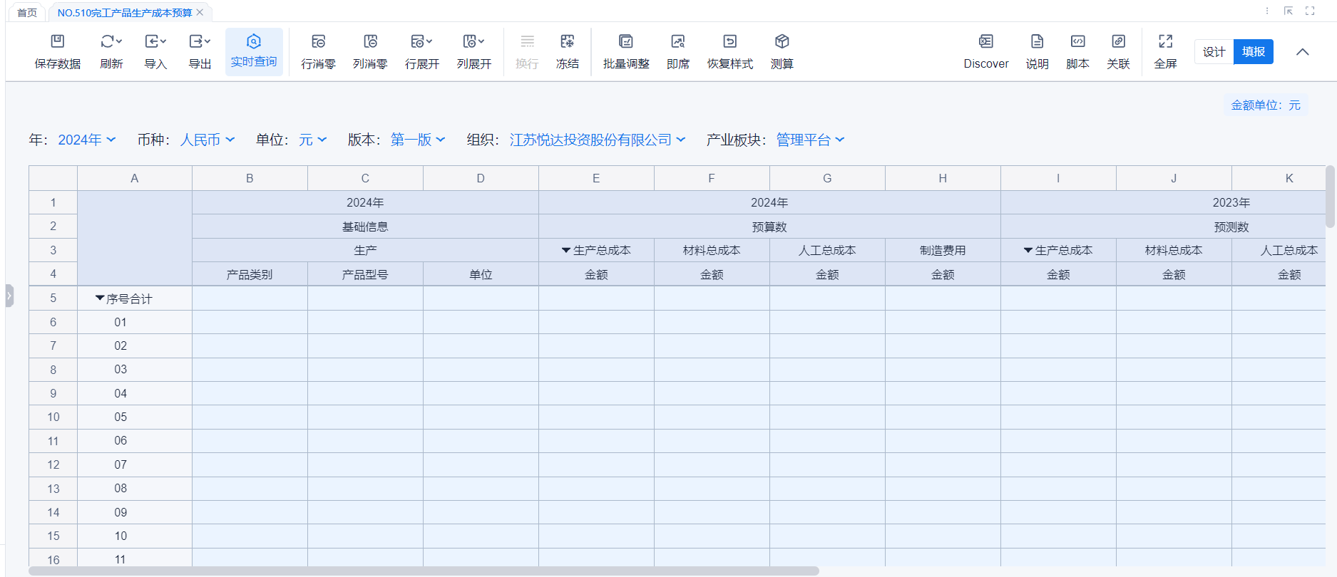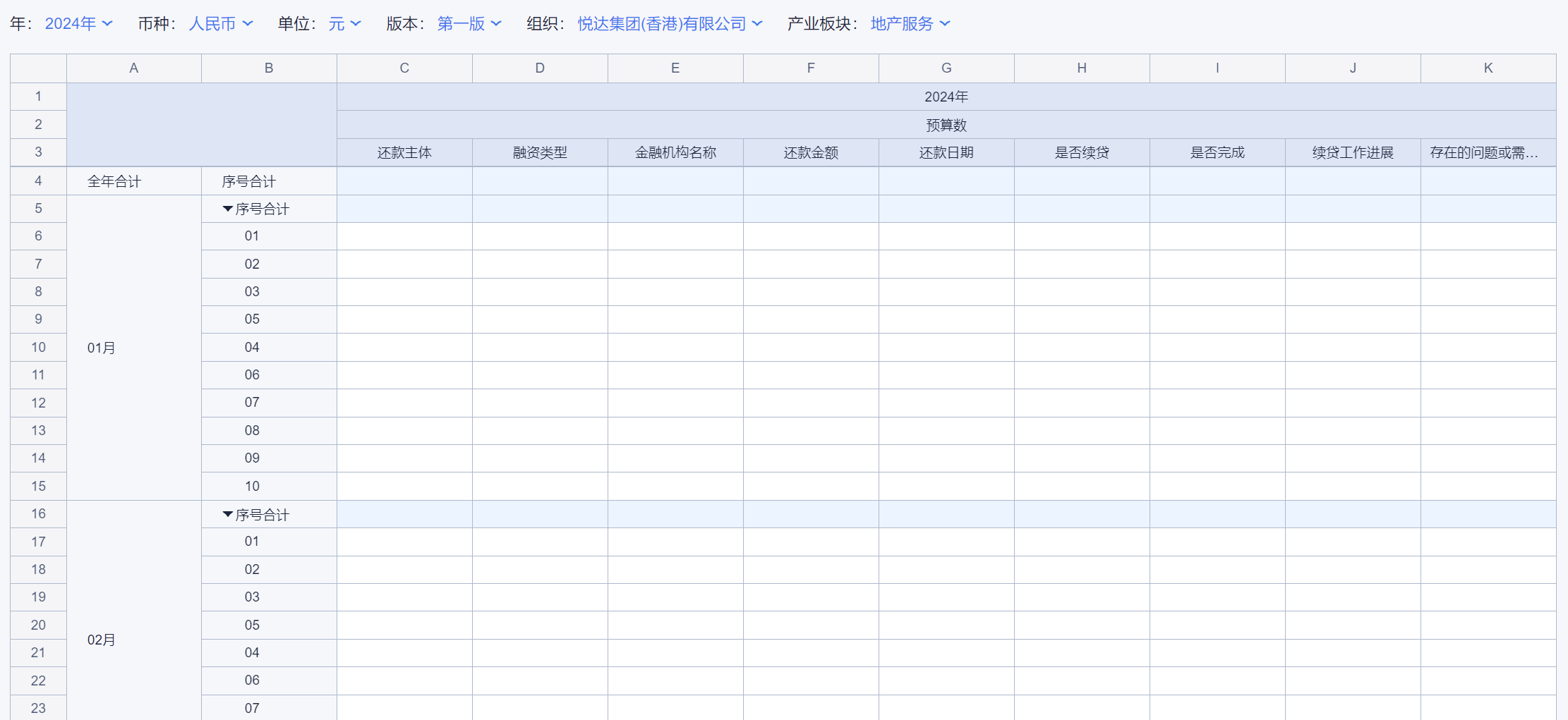 1、本表分产品类/项目类/房地产类/金融类展示年度预算模块的基础信息以及预算数,取自《主营业务收入预算》