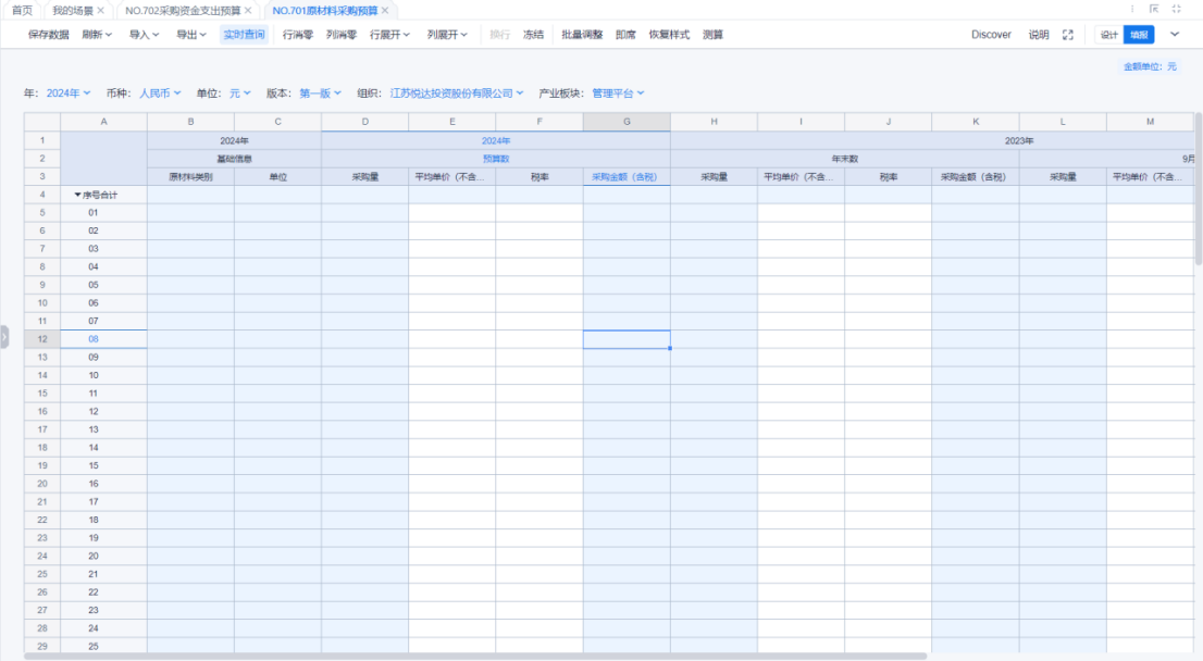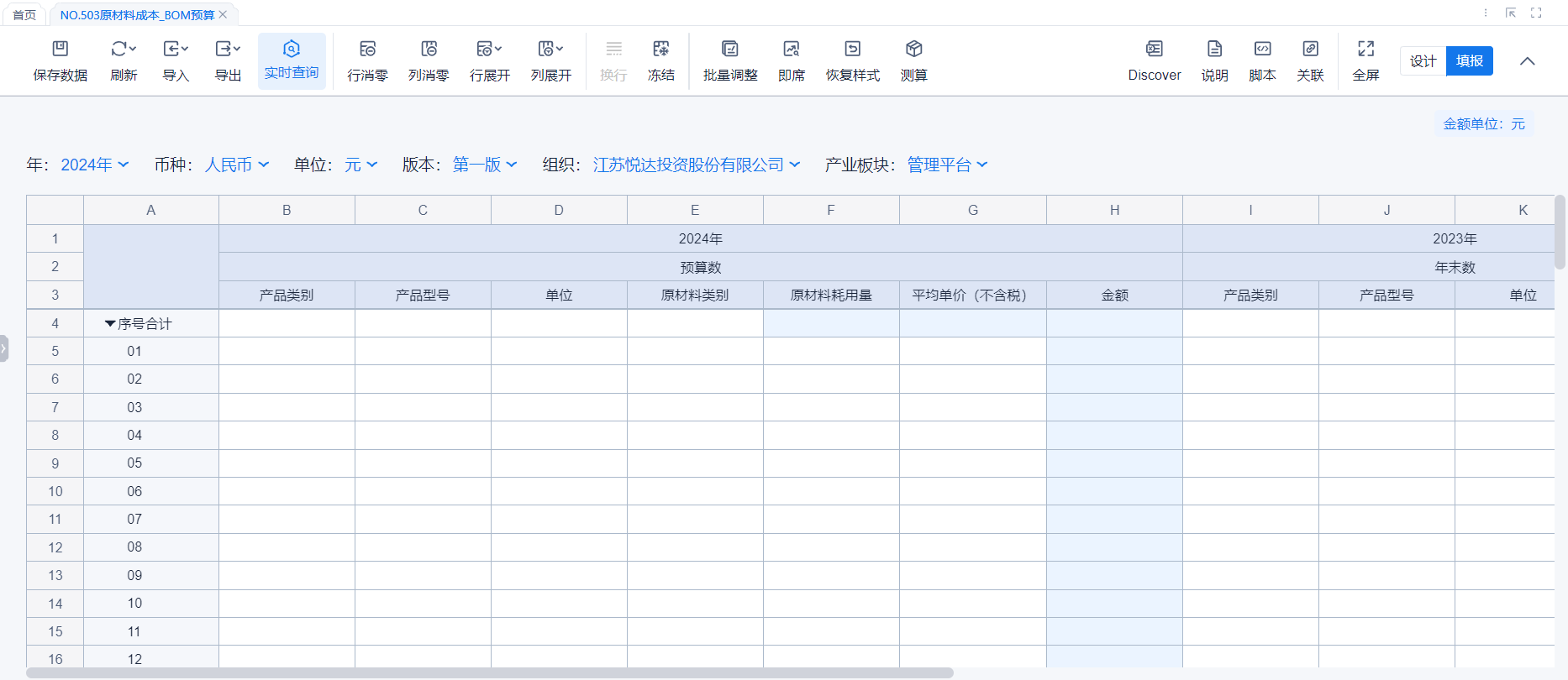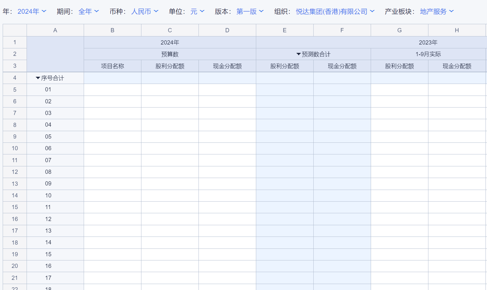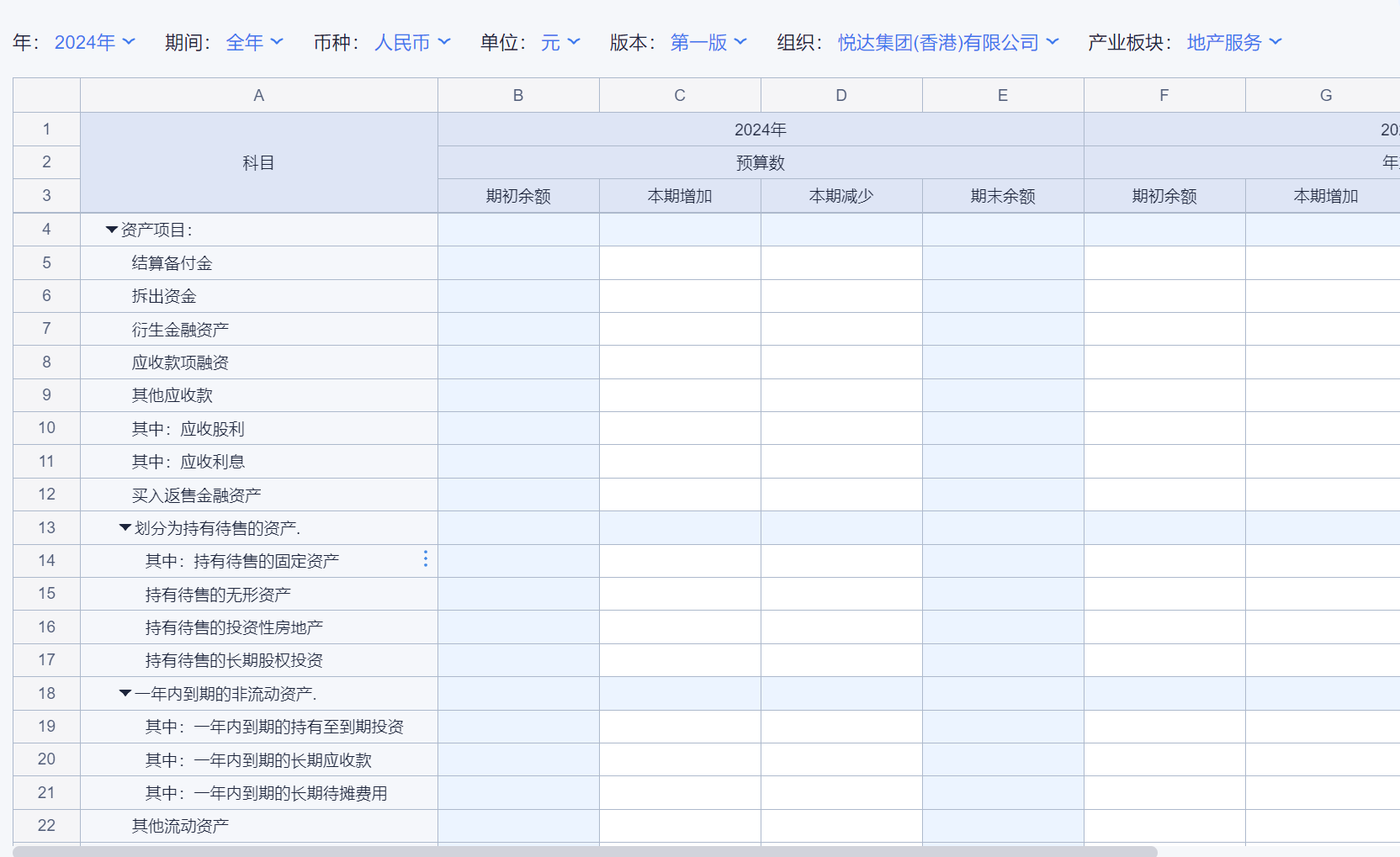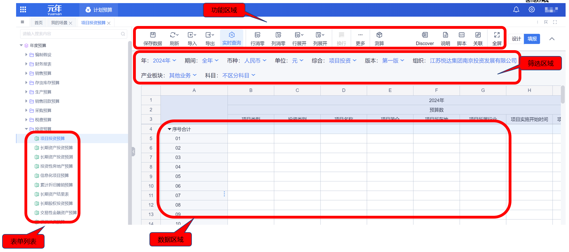 1、本表分产品类/项目类/房地产类/金融类展示年度预算模块的基础信息以及预算数,取自《主营业务收入预算》
