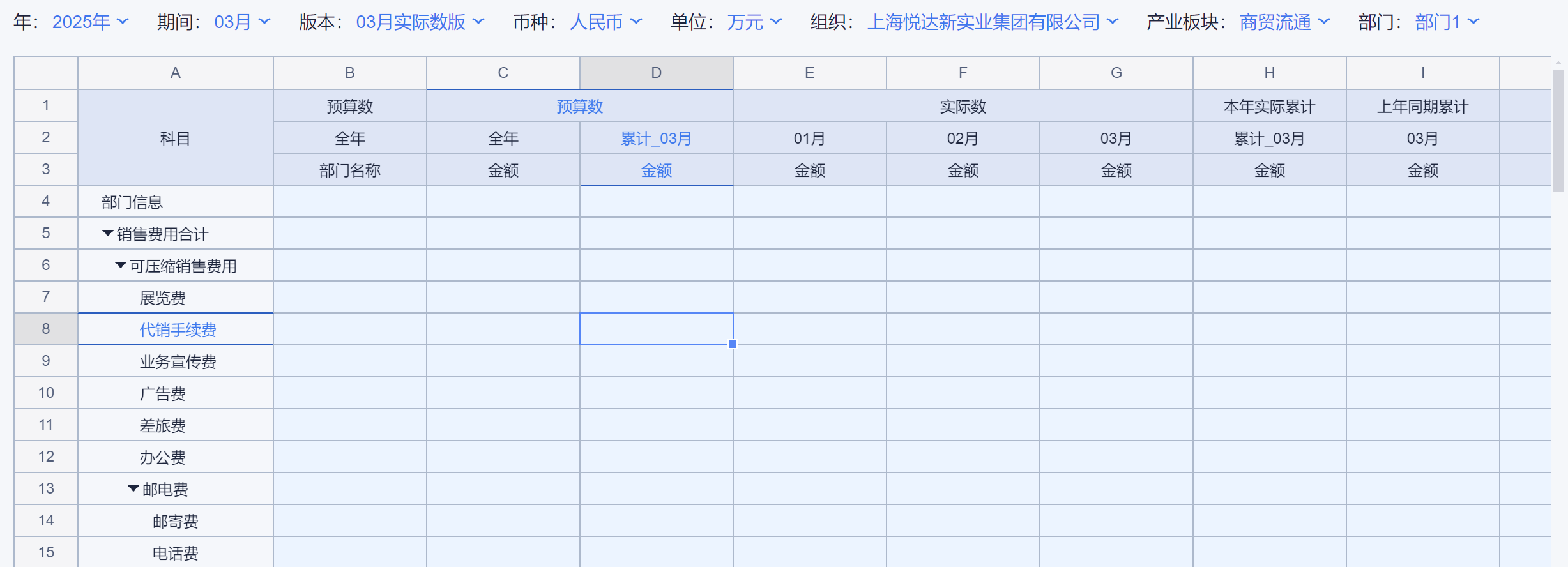 4、本年实际累计数=各部门的本年实际累计数之和