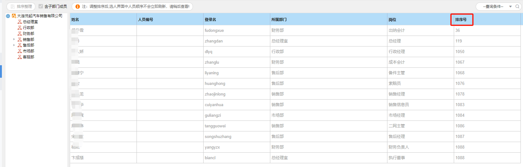 如果需要对单位内员工通讯录进行排序,单位领导展示在前面,则需要维护人员信息页签路径下的人员排序号,系统就会根据排序号从小到大的顺序排序,排序号较小的人员会显示在通讯录前面。