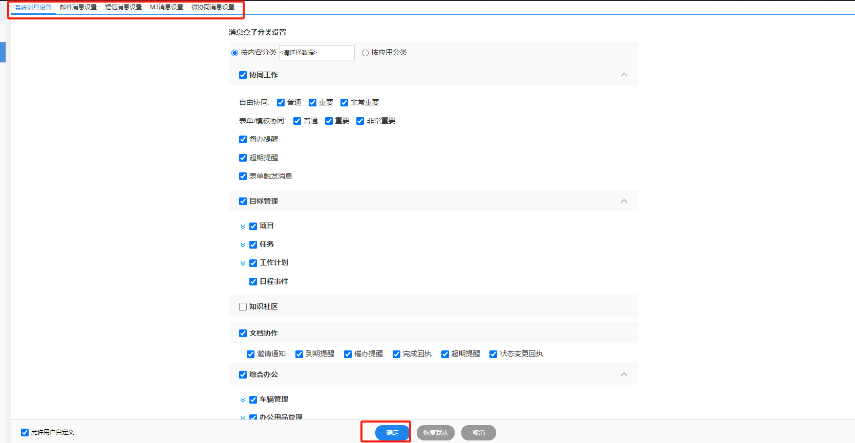 用于单位管理员统一控制前台人员的消息提醒设置,可根据实际情况勾选消息是否提醒推送。