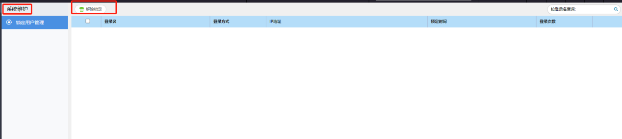 展现系统所有被锁定的帐号信息。根据【系统参数设置】中【登录失败次数】和【禁止登录期限】的设置,当用户超过输入超过限制后,则帐号被锁定,可通过系统管理员解除锁定。