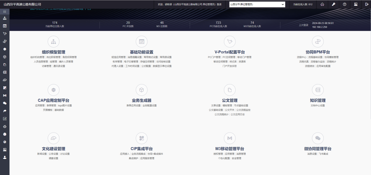 在系统上线阶段,已由集团管理员分配好各单位的单位管理员,一般由本单位IT岗或行政岗用户绑定单位管理员角色,该用户正常登录后在系统右上角切换到后台管理后即进入单位管理员界面。