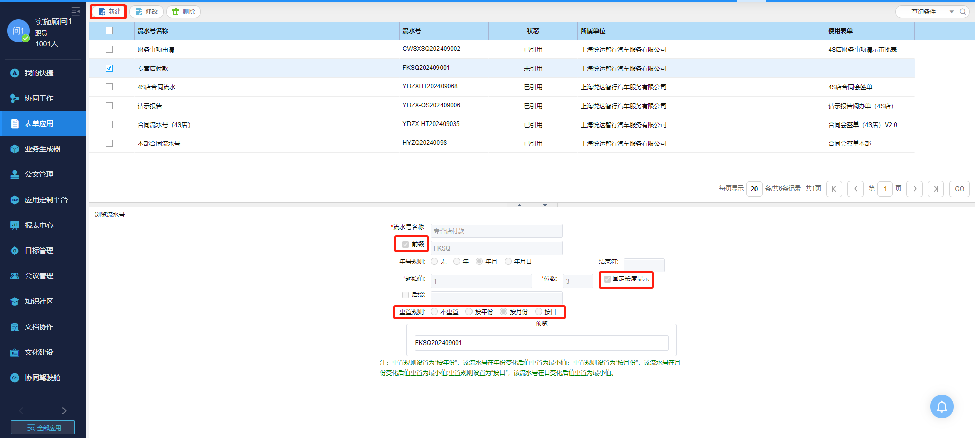 新建流水号时需要定义好流水规则:如前缀命名、流水重置依据等。