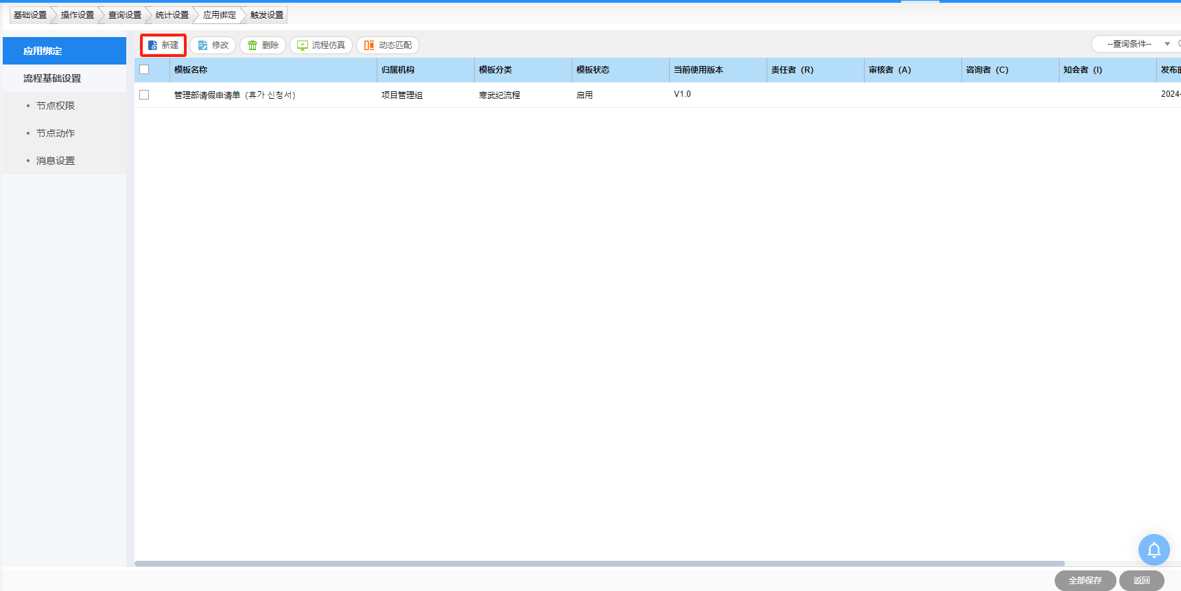 点击应用绑定页签下的新建按钮,会弹出对话框,填写模板名称、调用范围、合并策略、督办人员等信息后,在流程制作页签编辑表单审批流程即可,如图所示。