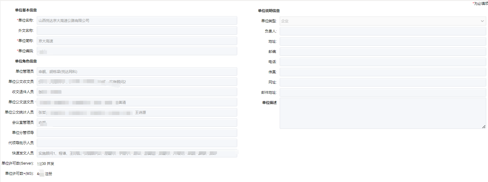 维护本单位基本信息,可以自行增加单位管理员,维护单位名称(如遇单位更名情况),其中单位编码不得自行修改,否则会影响OA与NCC系统的数据集成接口。