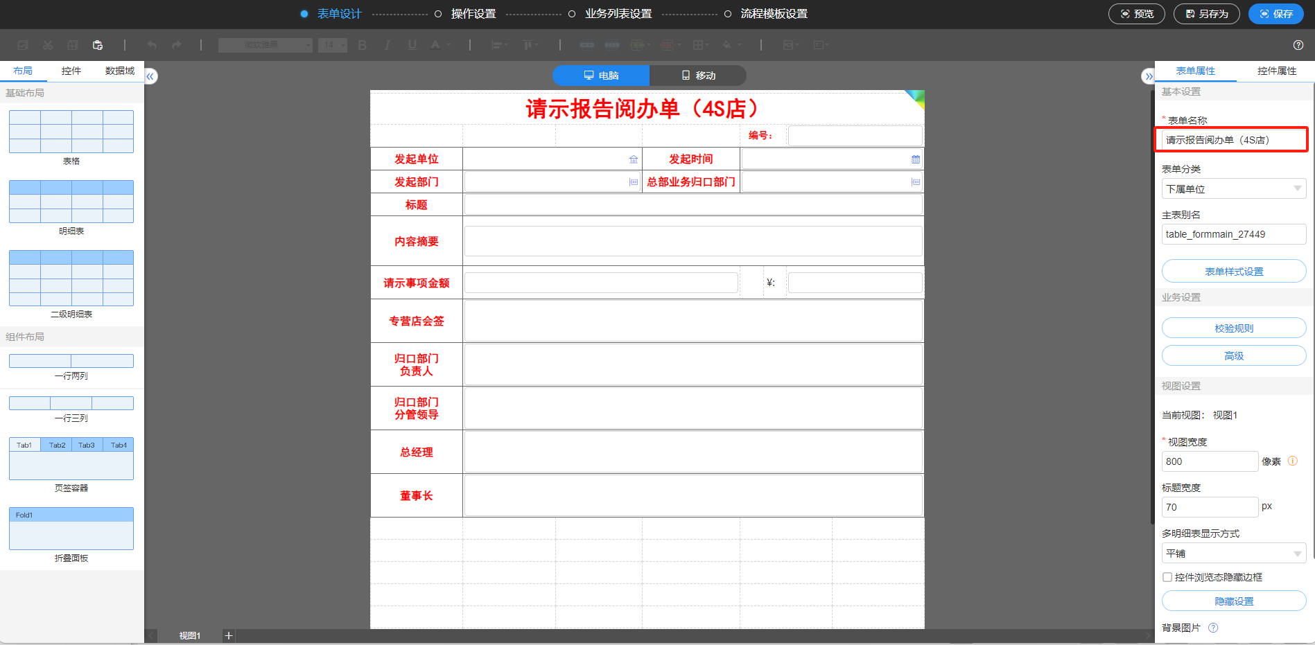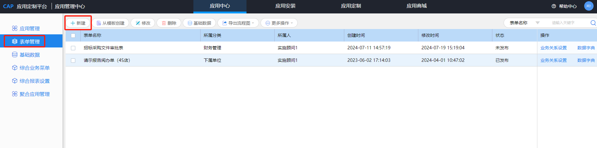 应用设计师点击应用平台定制-应用管理中心-表单管理,点击新建,根据需求部门提供的表样在此新建绘制。