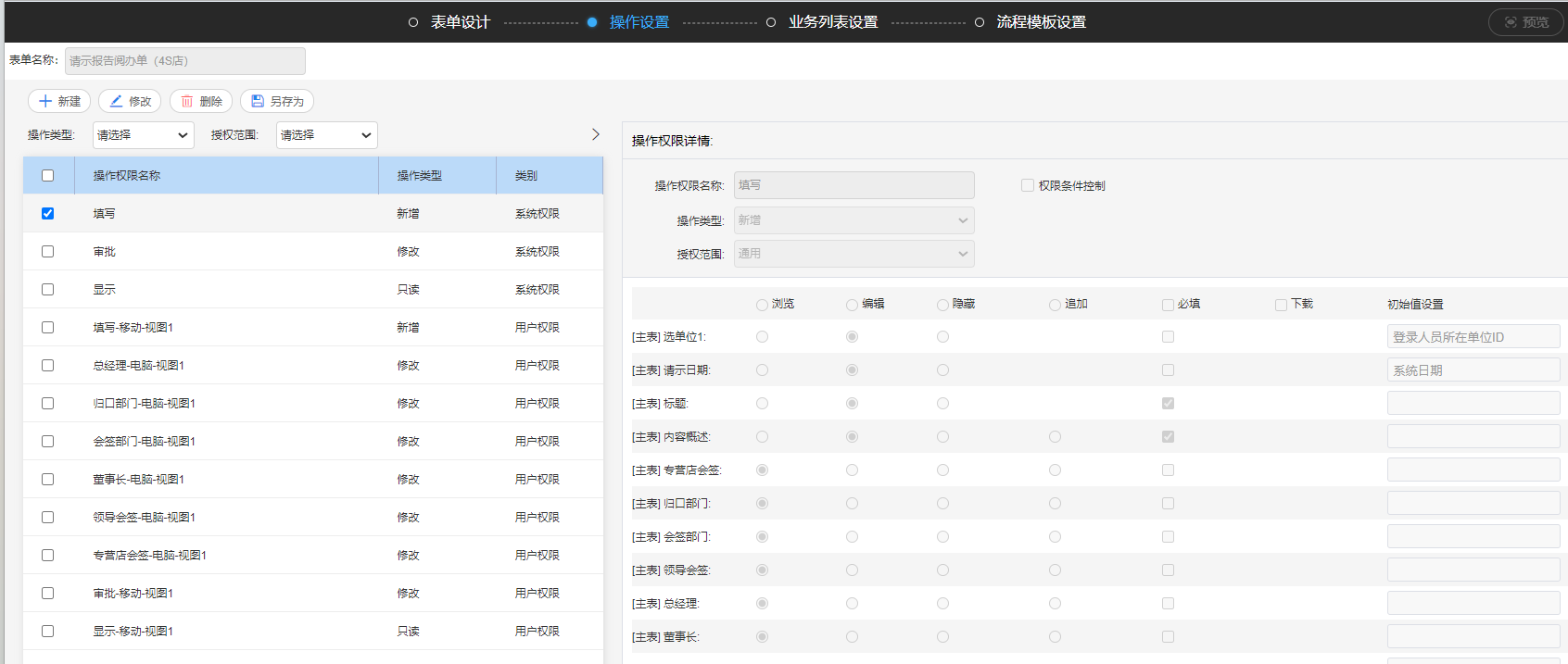 点权限,对应的修改就是总经理范围的修改填写权限。如发起者填写这个节点权限,只能填写发起者相关的字段,领导审批的相关字段都是浏览的权限。