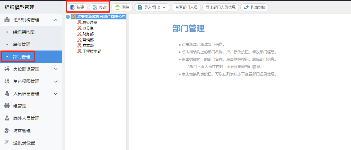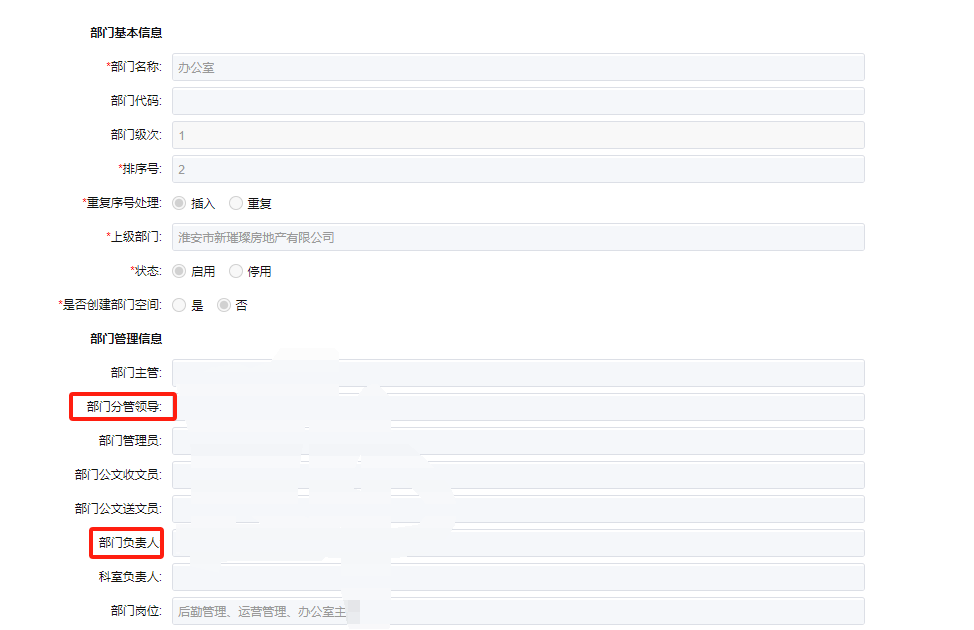 此功能管理本单位的部门信息。具体包括单位部门信息的新建、修改、停用等,各单位管理员需及时维护部门改部门的部门负责人及部门分管领导。如未维护,则系统流程可能匹配不到对应审批人,需要手工选择人员。