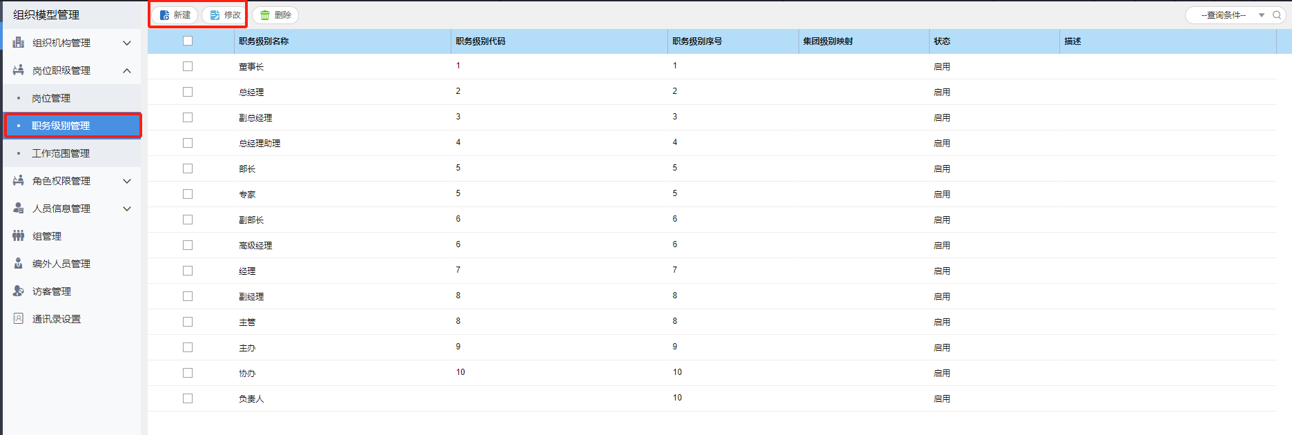 本功能管理本单位职务级别信息。通过职务级别控制用户的访问工作范围,也可以通过职务级别实现流程的自动判断,如差旅标准。