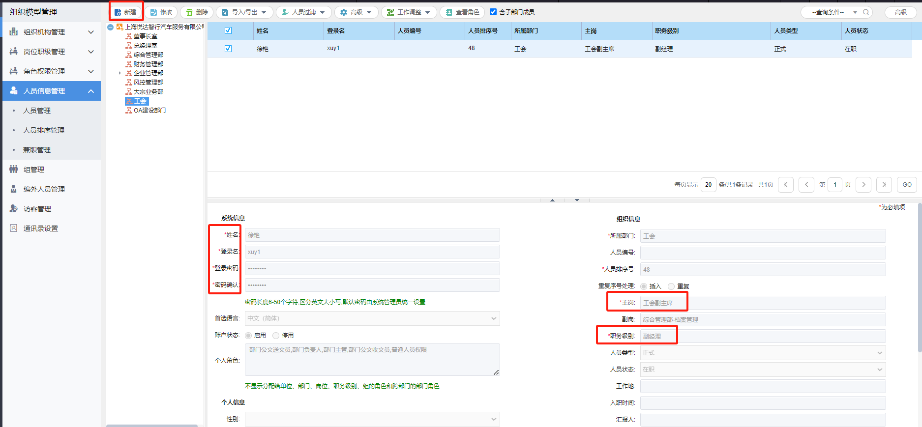 人员信息新增时,带星项为必填,如登录名,一般默认是姓名拼音,考虑到全集团重名等因素,如保存提示登录名重复可调整大小写及数字,如"zhangs"提示登录名重复后,可调整为"Zhangsan","zhangsan01"等方式用于区分。员工发生部门调整变动时,单位管理员登录系统进行人员修改,调整岗位及职级信息即可。如果员工在本单位担任多个岗位,则维护副岗信息即可,如果员工在外单位存在兼职信息,则联系集团信息化管理部或网科运维组维护兼职信息即可。
