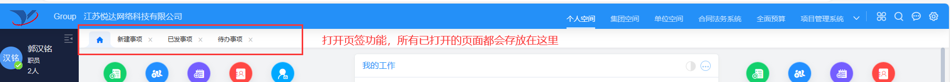 屏幕上方的粉色框线内为主要的导航的控件设置,可以将最常用的关联系统放在这里,如合同法务系统。