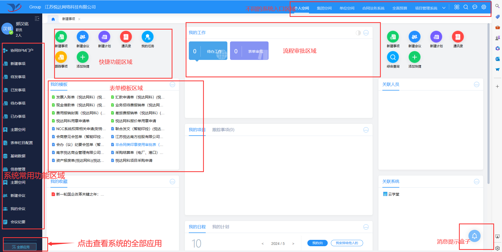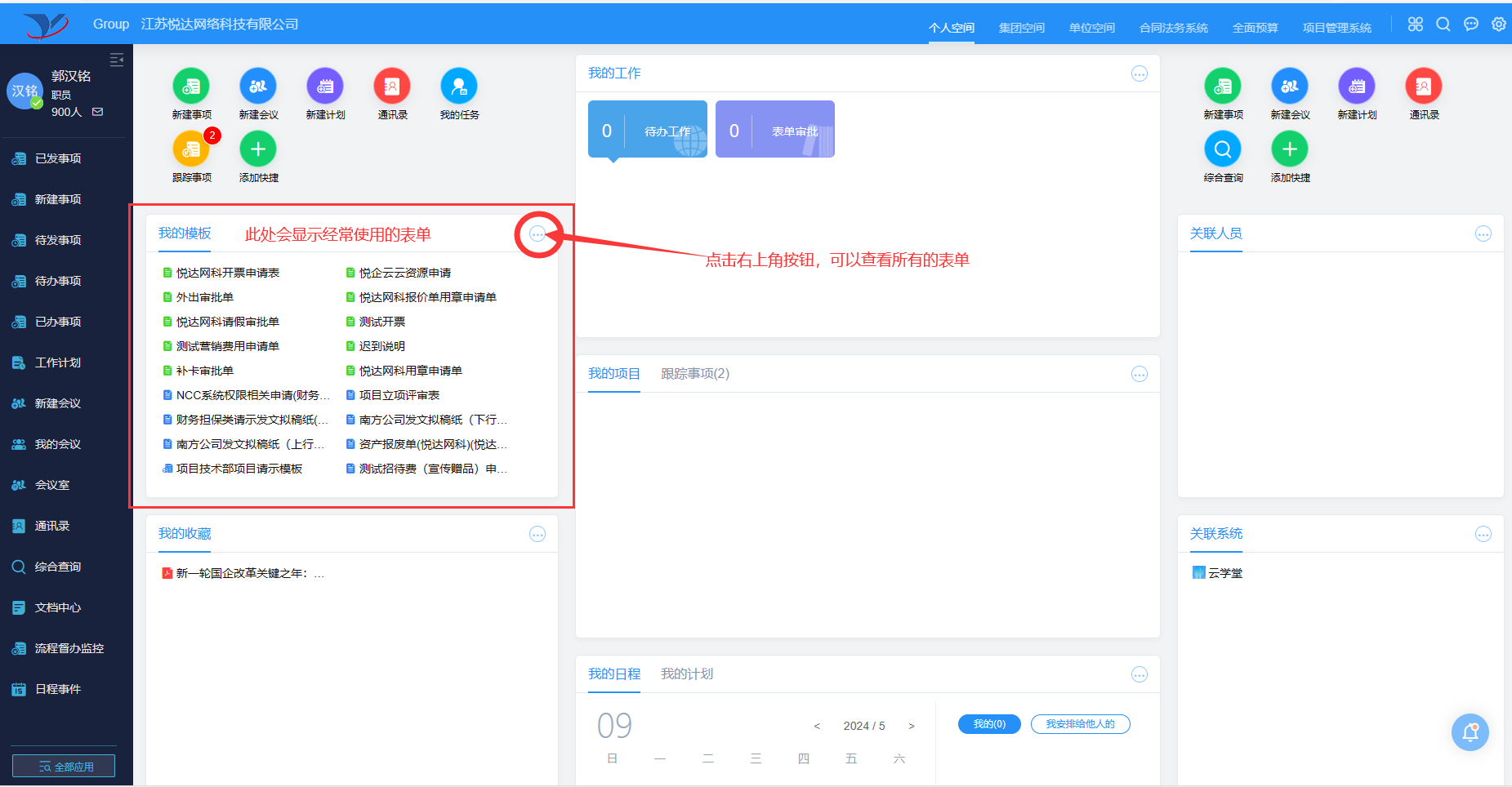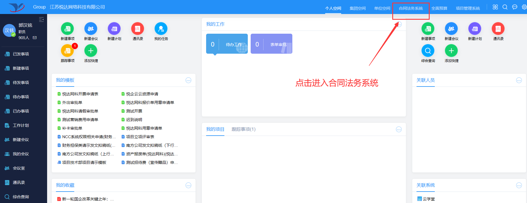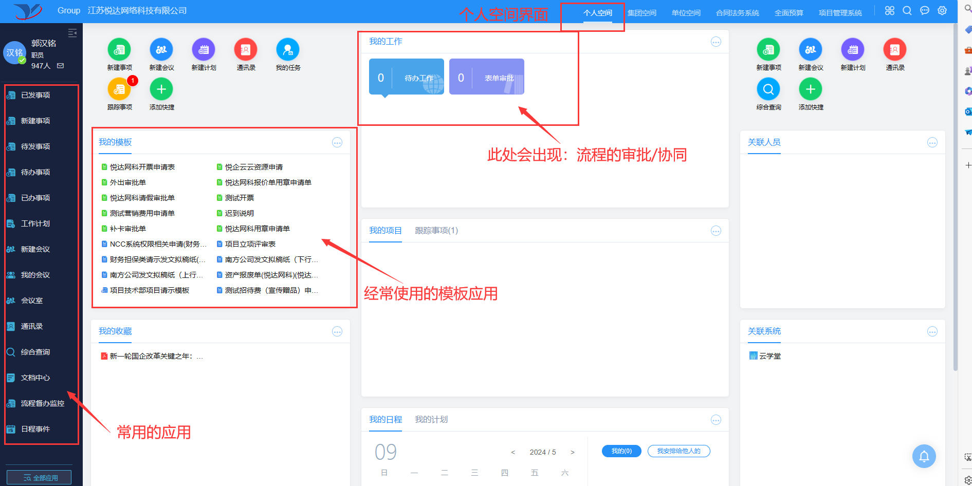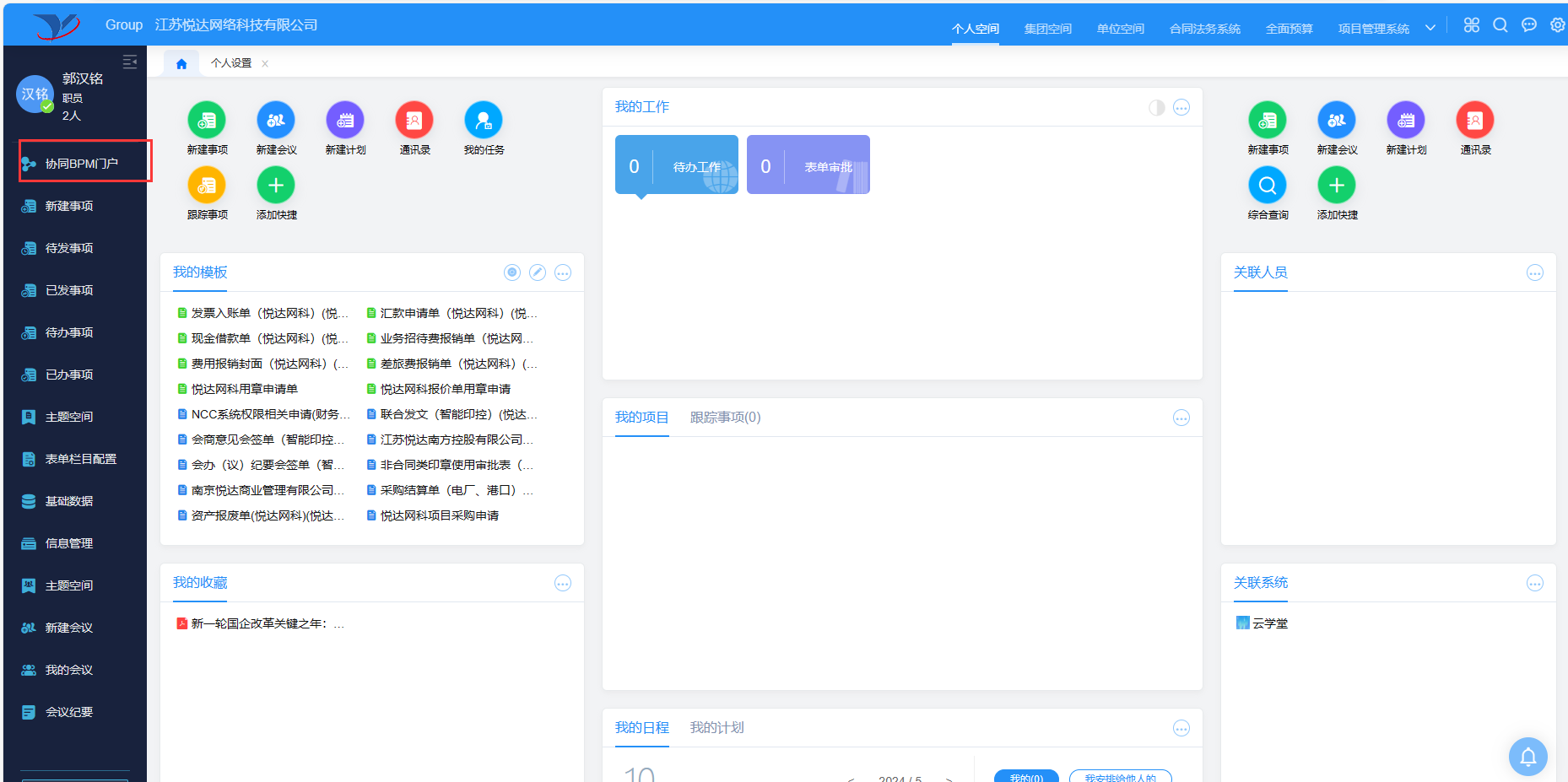 个人空间是最主要的工作界面,在此包括了OA绝大数的工作应用。在页面最上面可以与项目管理系统、合同法务系统等进行无感互联。