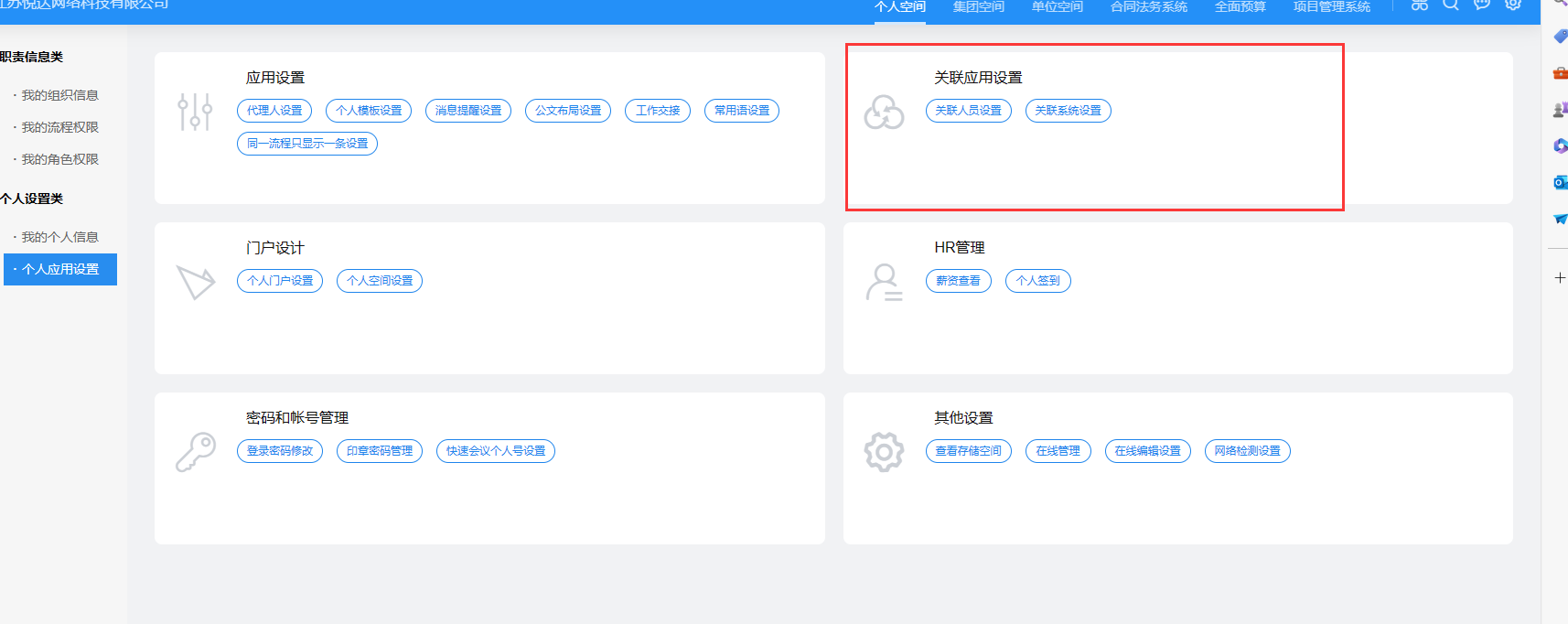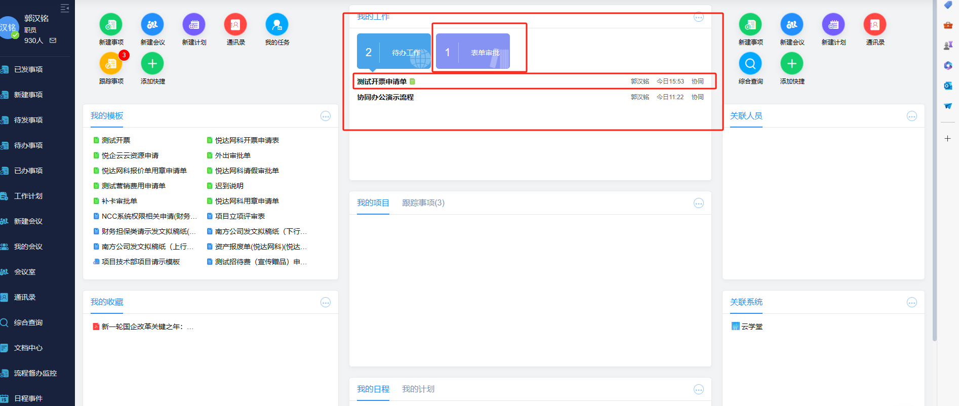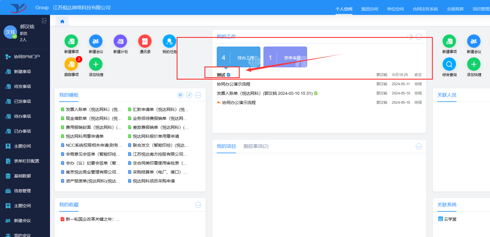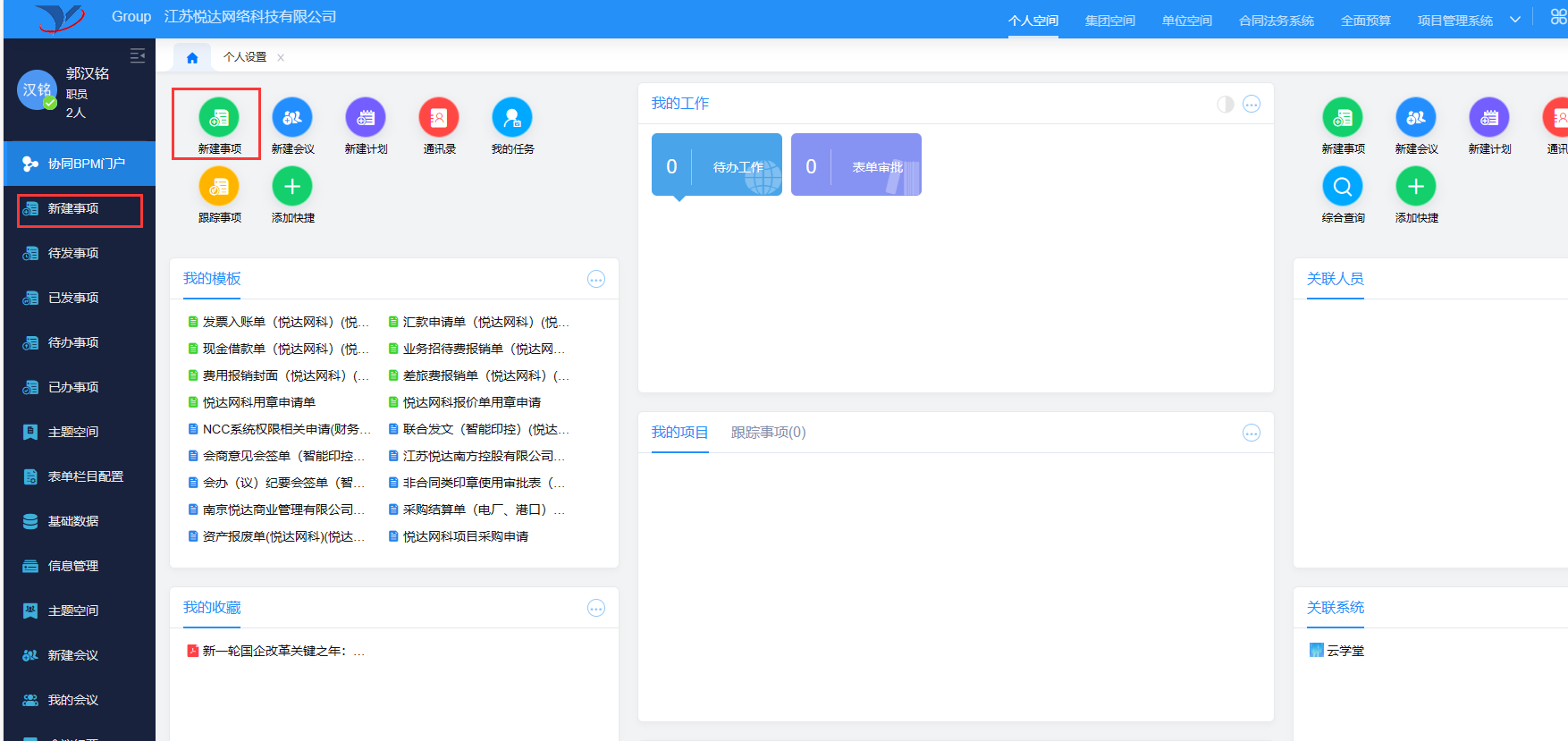 个人空间是最主要的工作界面,在此包括了OA绝大数的工作应用。在页面最上面可以与项目管理系统、合同法务系统等进行无感互联。