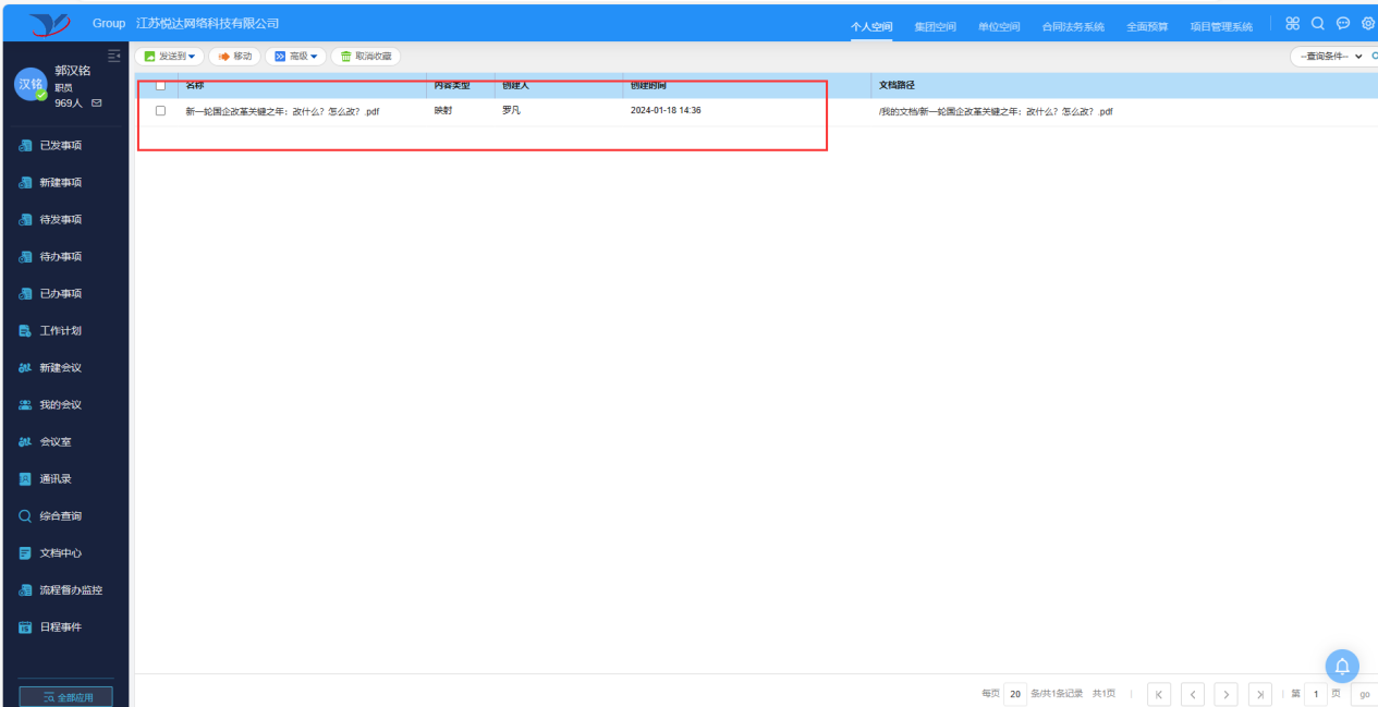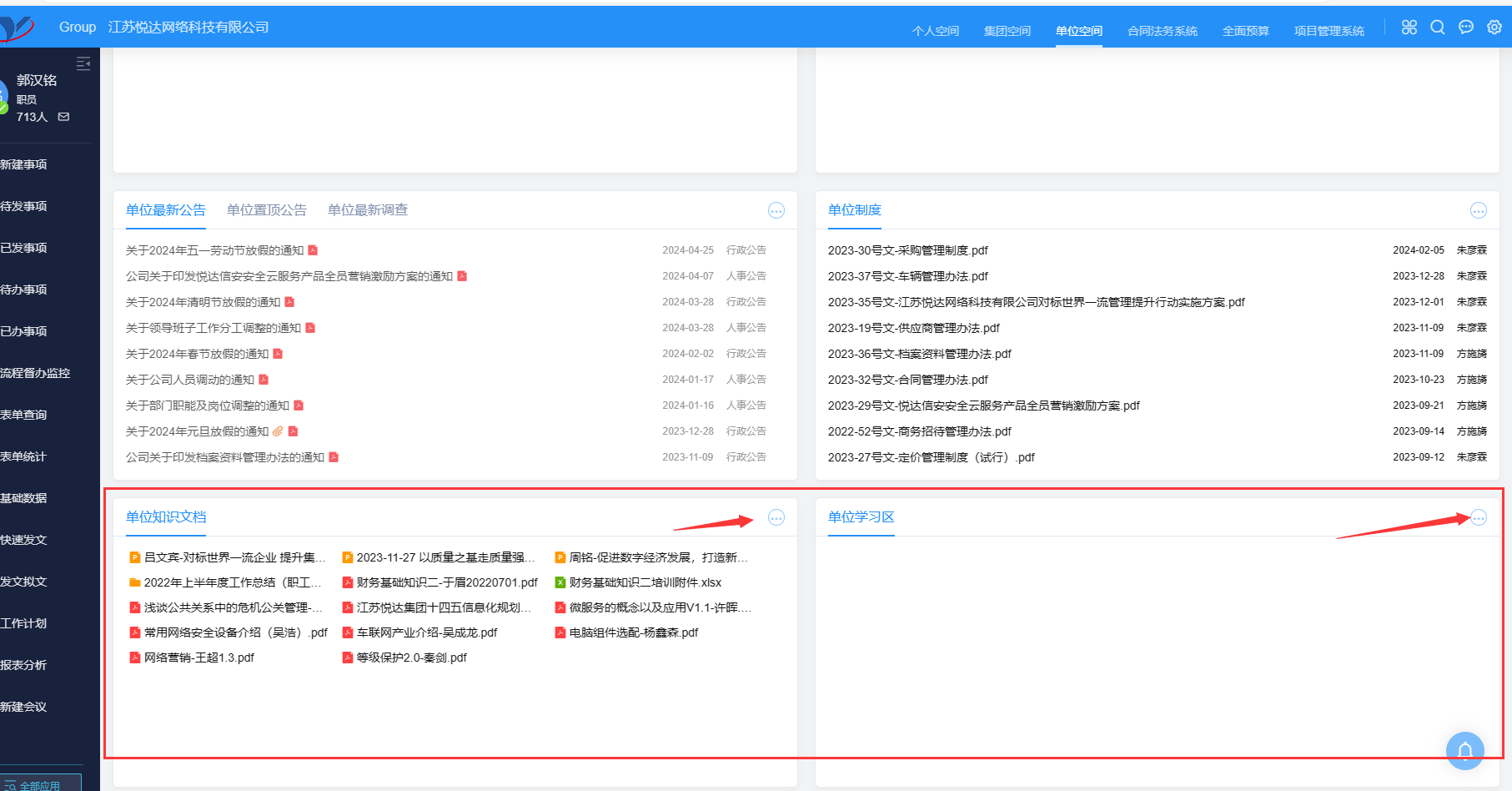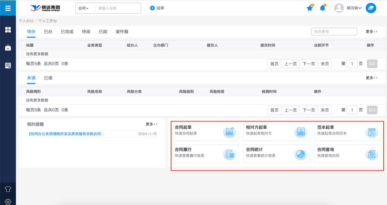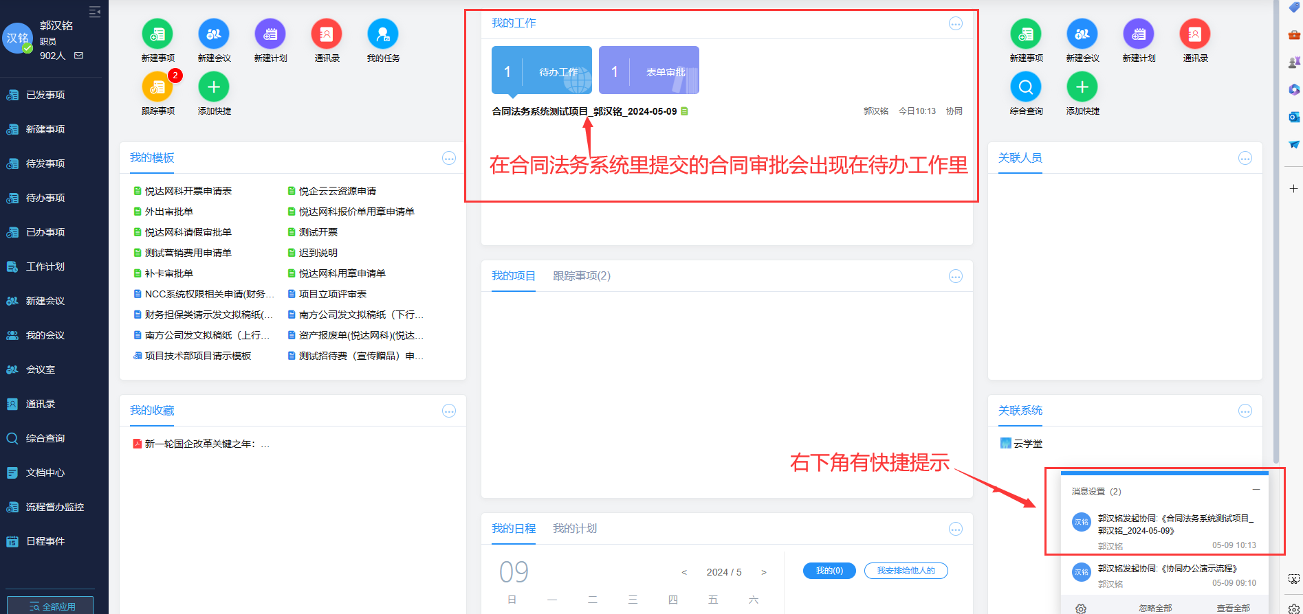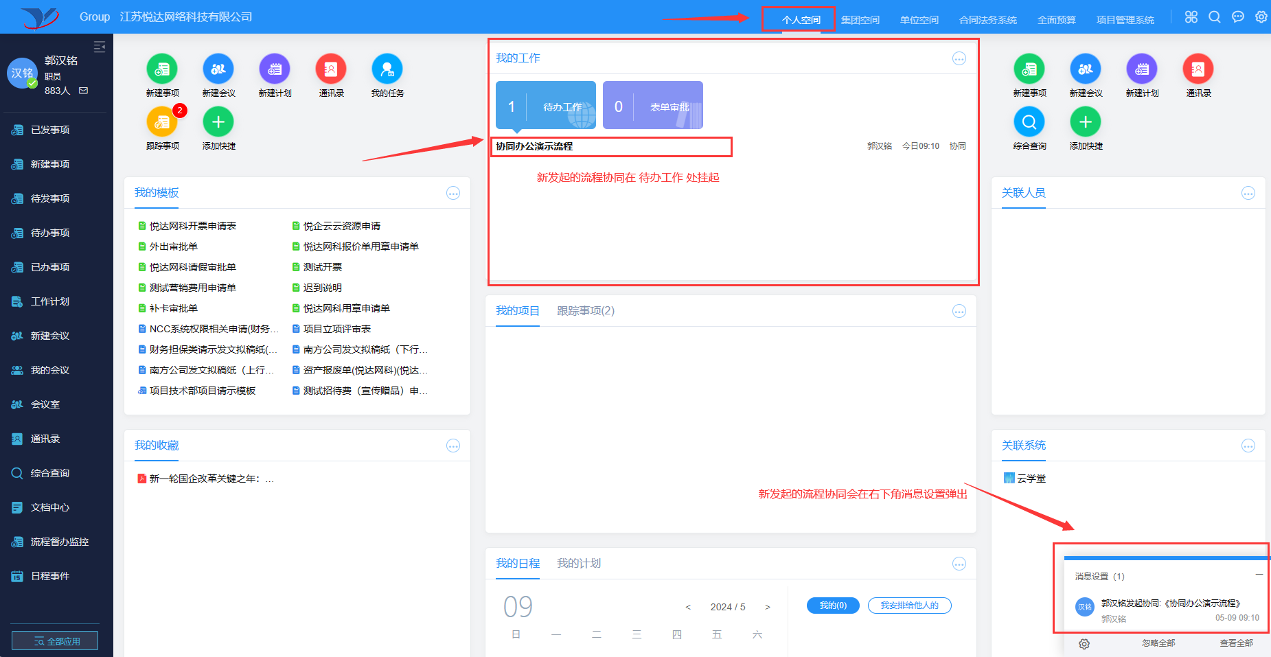 个人空间是最主要的工作界面,在此包括了OA绝大数的工作应用。在页面最上面可以与项目管理系统、合同法务系统等进行无感互联。