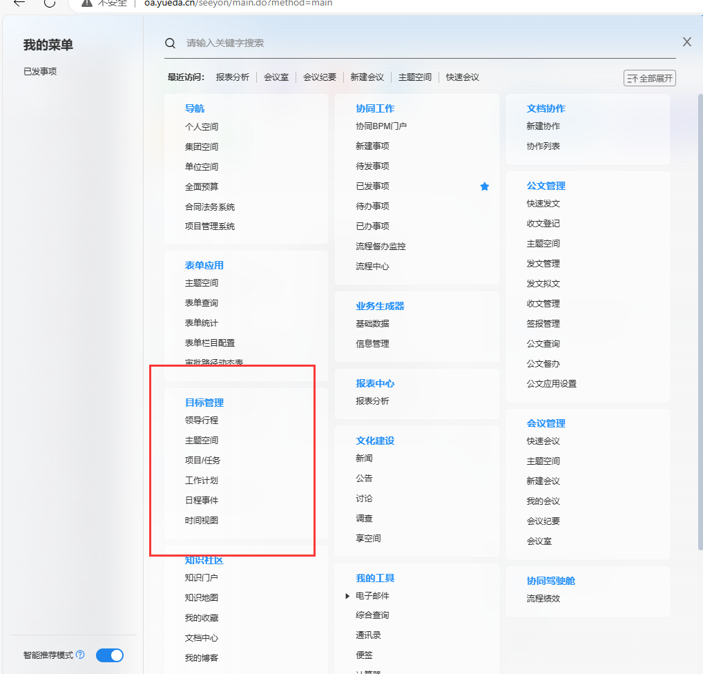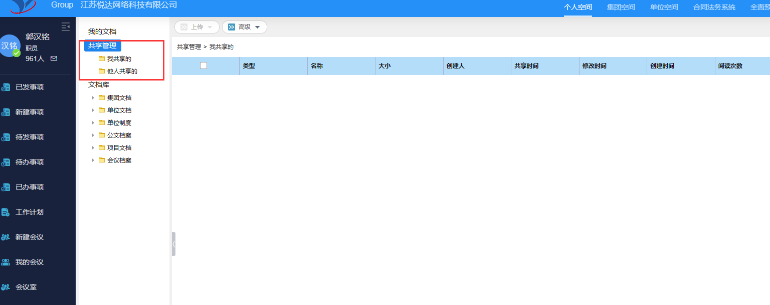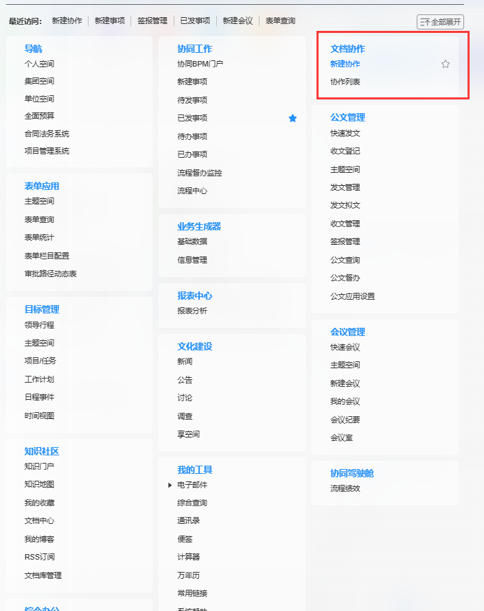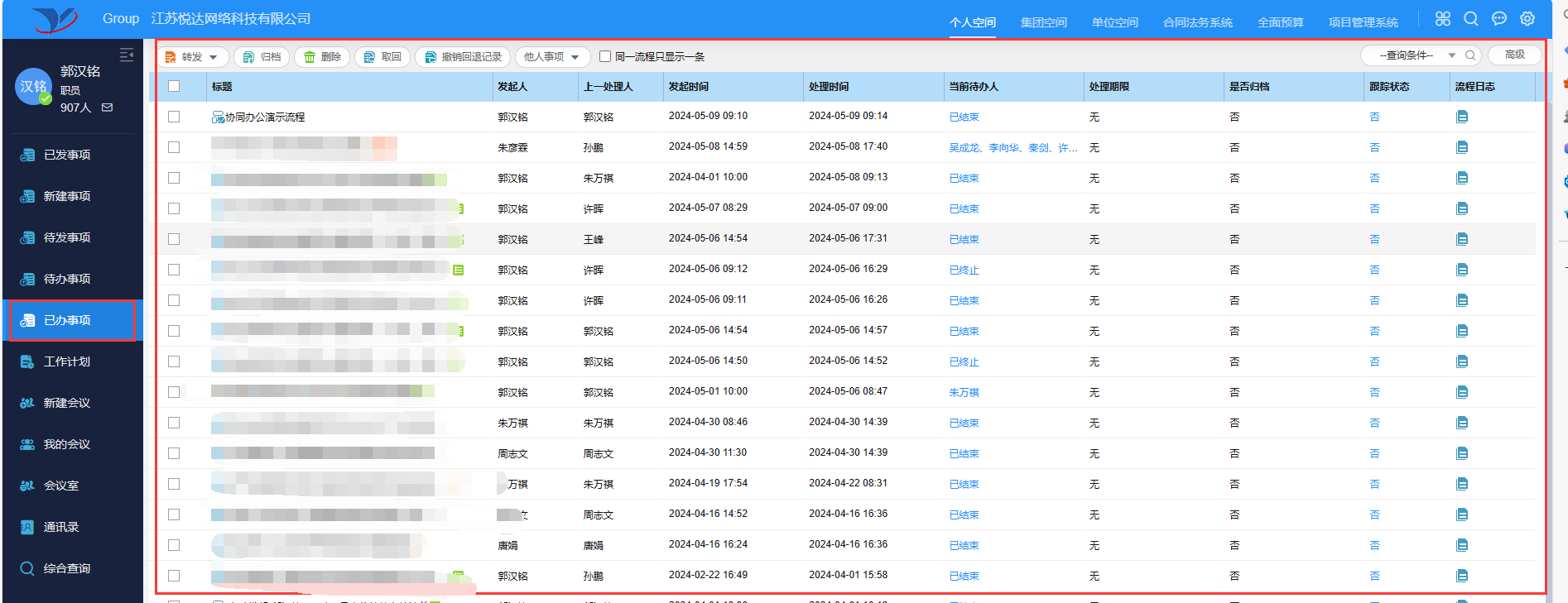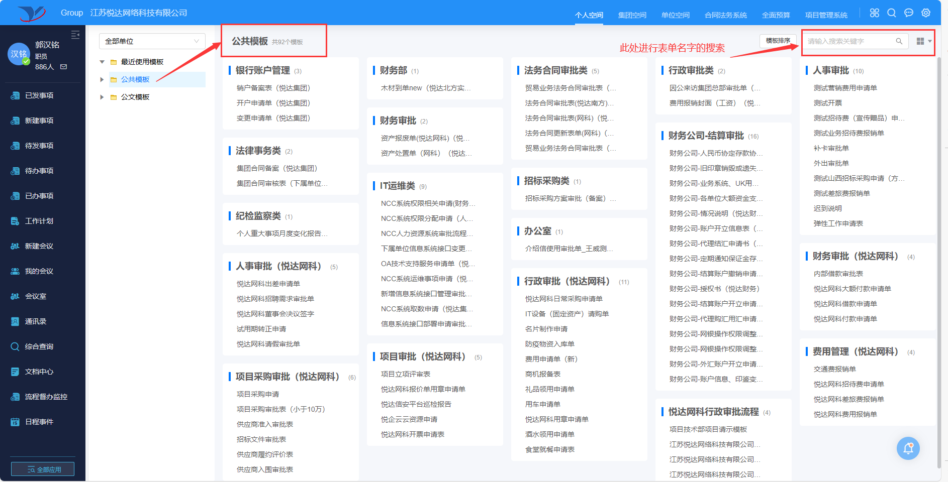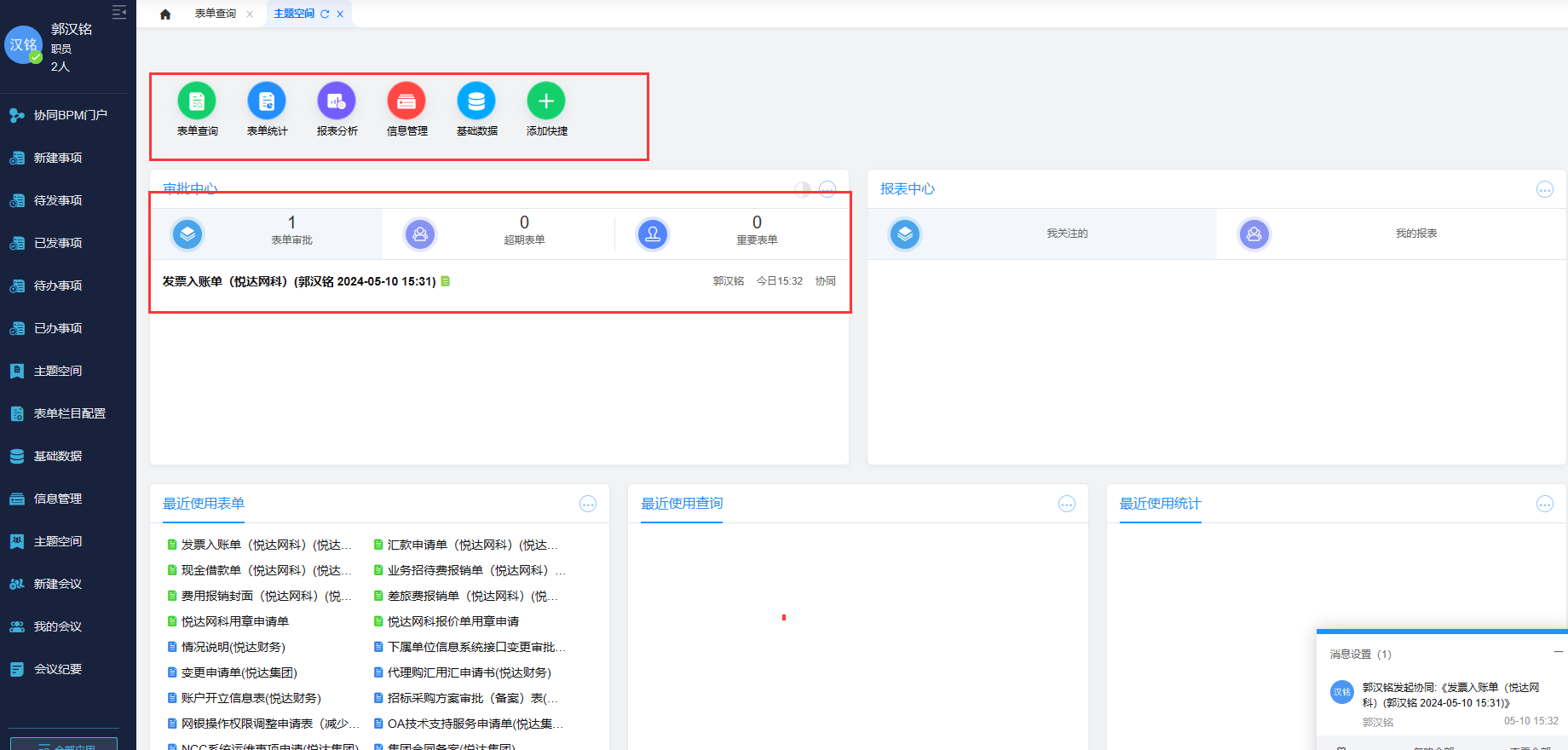 个人空间是最主要的工作界面,在此包括了OA绝大数的工作应用。在页面最上面可以与项目管理系统、合同法务系统等进行无感互联。