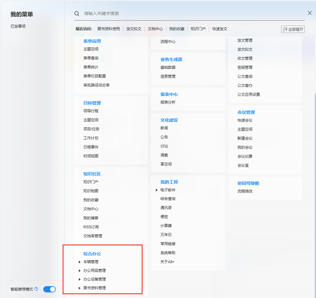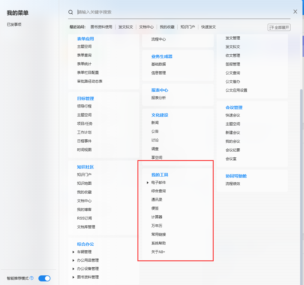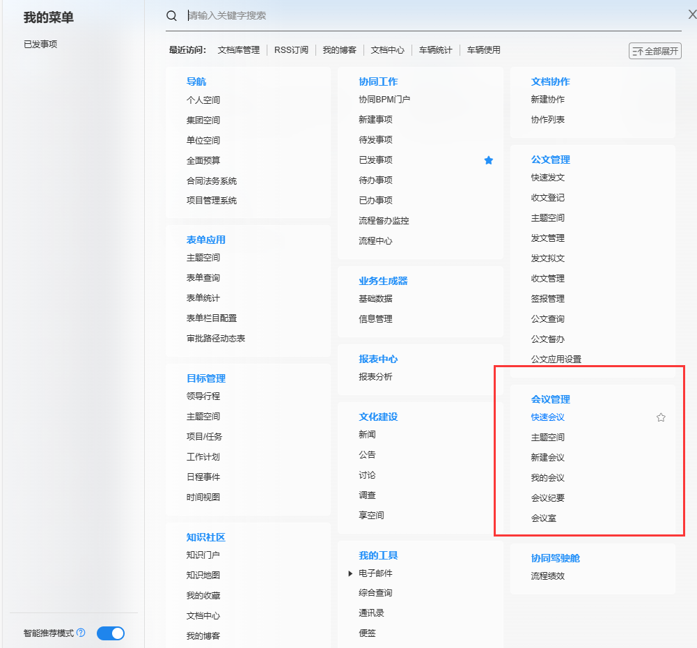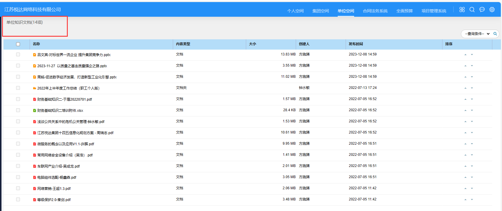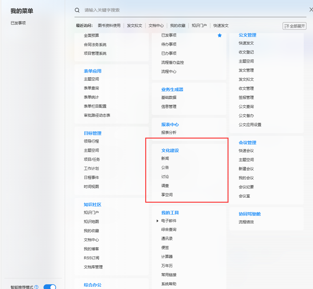个人空间是最主要的工作界面,在此包括了OA绝大数的工作应用。在页面最上面可以与项目管理系统、合同法务系统等进行无感互联。