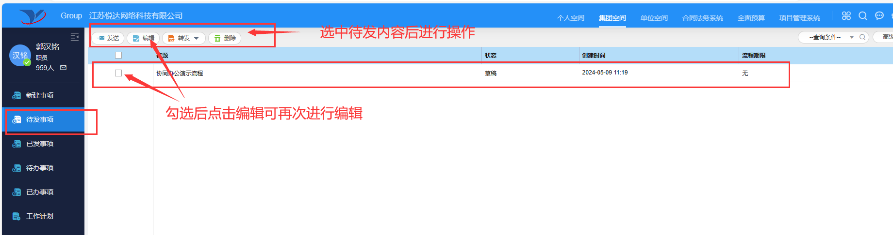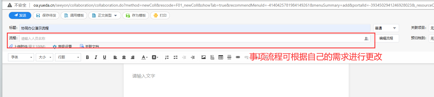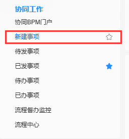 协同工作中的新建事项,包含了最基础的日常工作,新建事项需要由发起者本人将需要进行审批或者汇报的事项进行填写,填写完毕后点击发送进行审批过程,在此次事项中拥有审批/协同等权限的将会收到发起者发送的事项,像流水线一样一直到最后一个人审批/协同完成后才会结束。