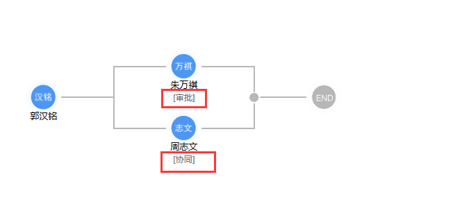 如郭汉铭发送消息,必须经过周志文同意后→胡栋梁→朱万祺→结束,如周志文未进行事项的协同/审批等操作,则胡栋梁与朱万祺不会受到此次事项的相关流程信息。
