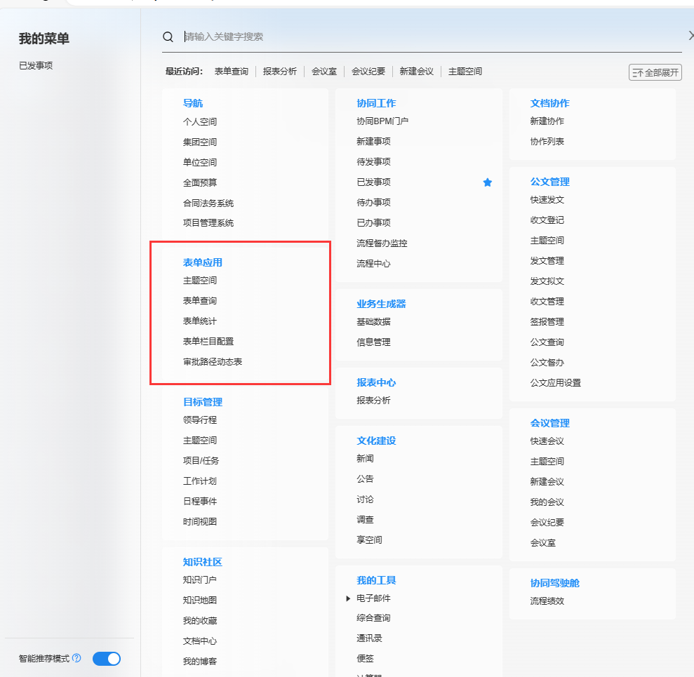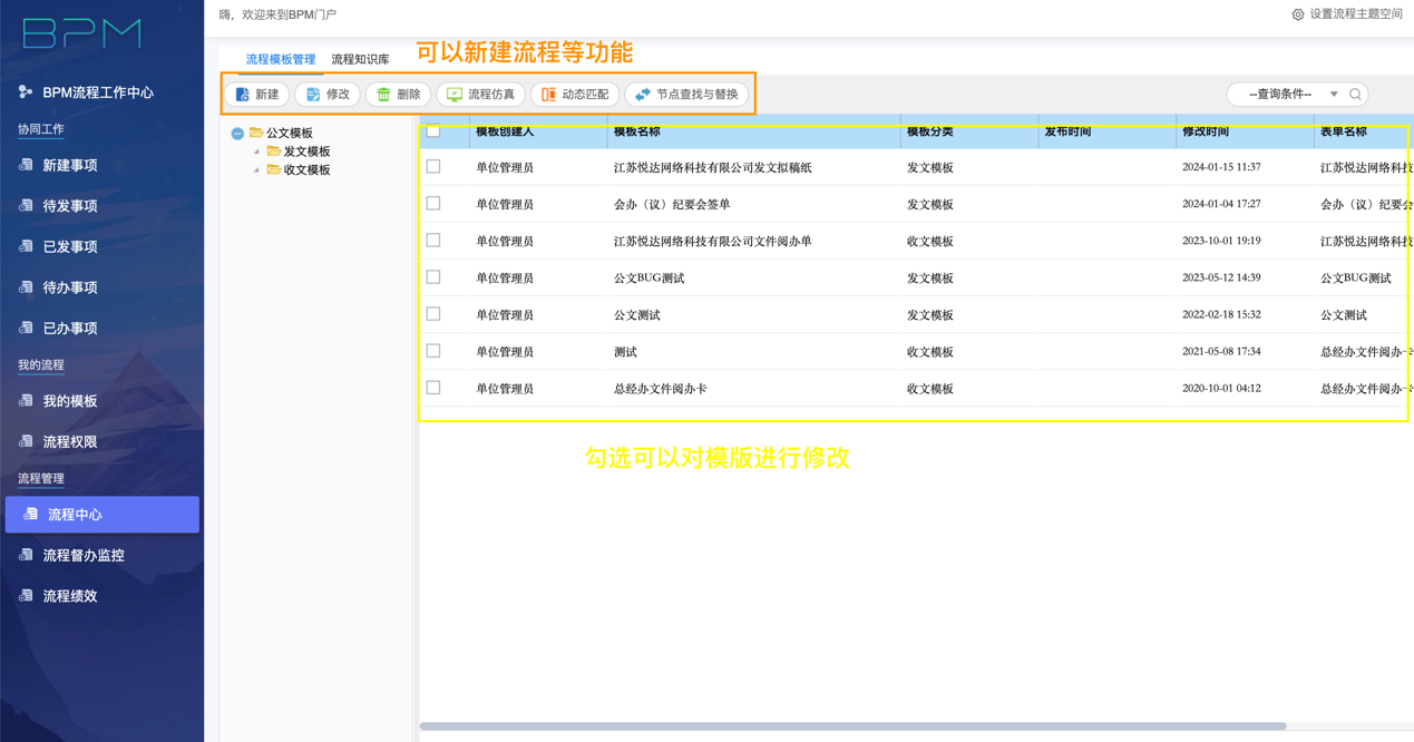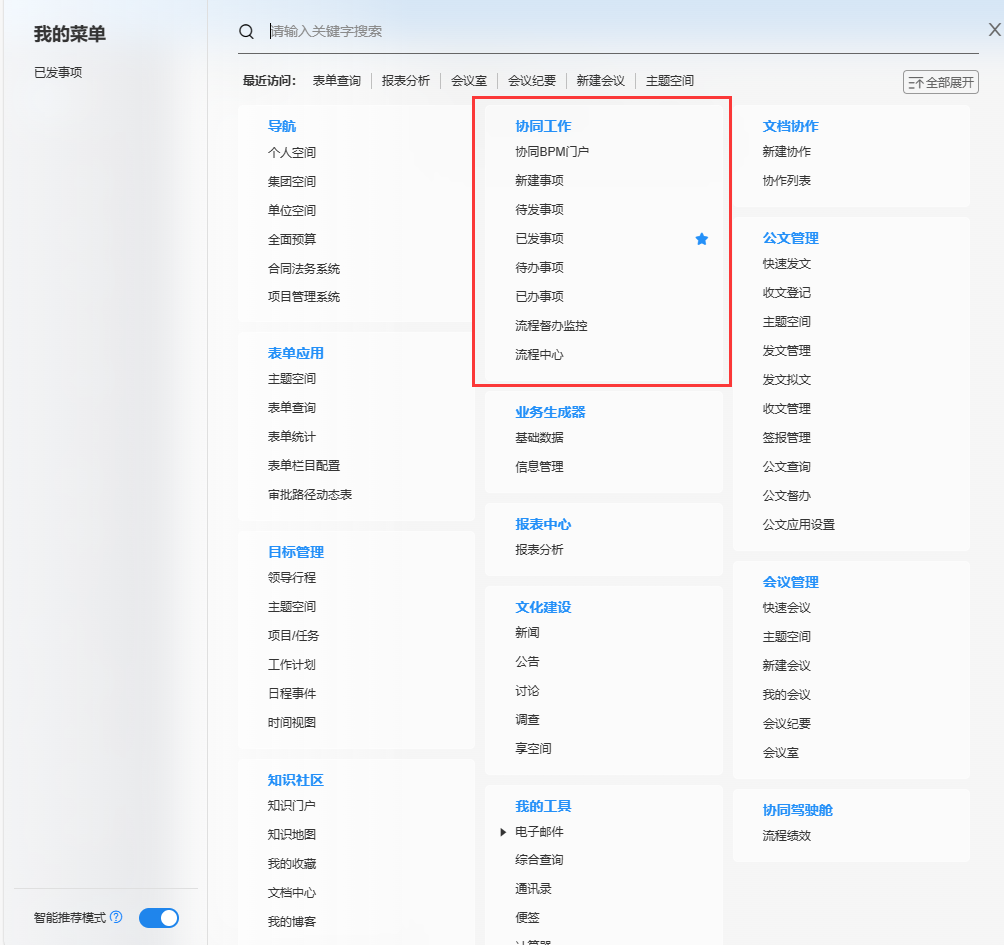 协同BPM门户将新建、待办、待发、已办、待办事项等功能收集在一个小型门户中,以及将协同办公流程都包含在内。可以新建事项、查看待发事项、已发事项、待办事项、已办事项。一般为了方便快捷,可以直接在主界面选择相应的功能即可。两个界面的功能一样,没有区别。