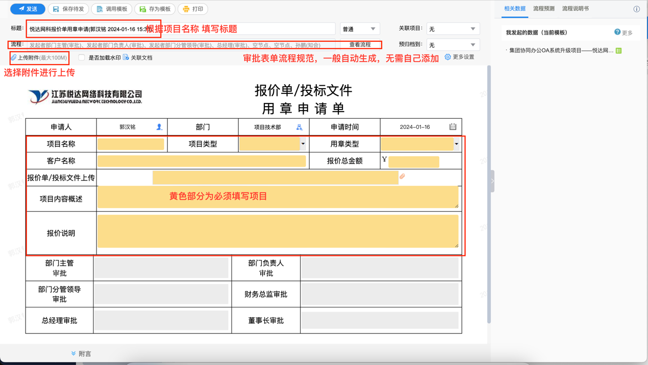 【步骤二】打开事项进入界面,首先填写标题,明确我们发送文件是什么,其次如有附件则添加附件,如有文档需要关联则关联文档(关联文档可以将已经发起/处理完毕的流程事项,进行快捷添加)。