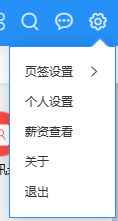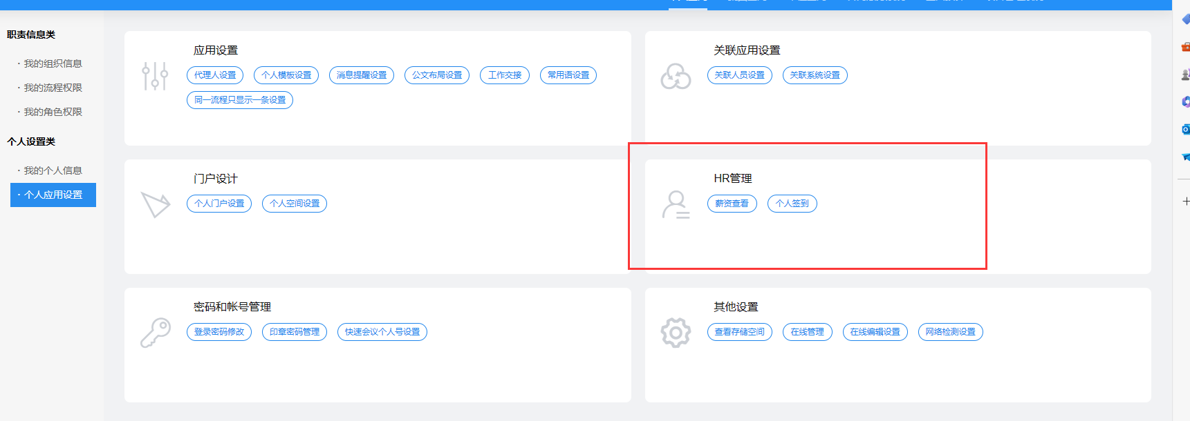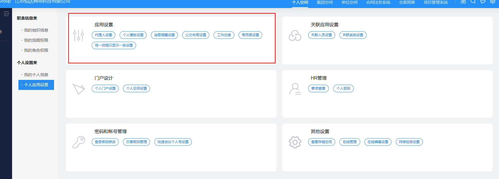 在个人空间内我们可以点击右上角的设置按钮,进行相关的设置。个人设置里包含了系统最基本的设置,最主要的是个人设置,在个人设置里面,可以查看我的组织信息,我们属于哪一个部门,可以查看我的流程权限,作为职员或者领导,我们在系统中可以使用到哪些流程权限/角色权限。