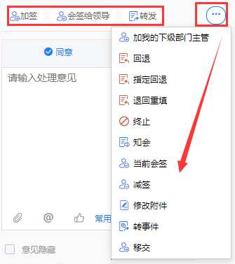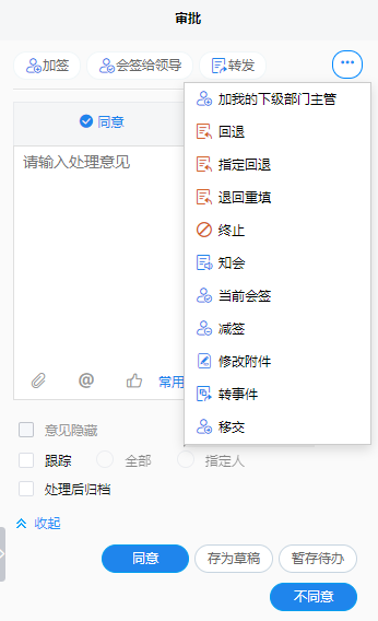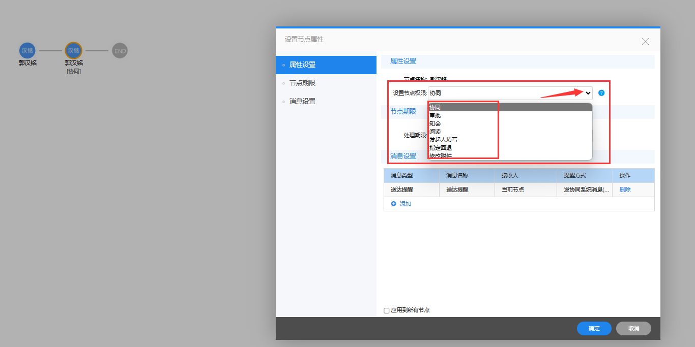 【加签】指在本节点处理后加审批人,权限需求(协同,审批,知会等)根据需求进行设置。