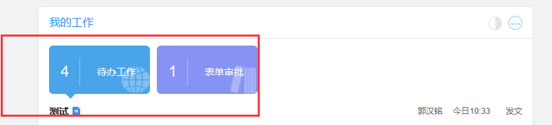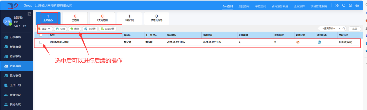 【步骤一】回到个人空间,找到我的工作,在待办工作中直接点击即可进入流程处理。所有的待办的流程都会在这个页面进行挂起,点击处理完毕后才会在带待办工作处消失。处理完别人发送的流程则会出现在已办事项里面,处理完自己发送的事项,会出现在已发事项里面,如流程中自己拥有协同/审批权限,则也会出现在已办事项里。