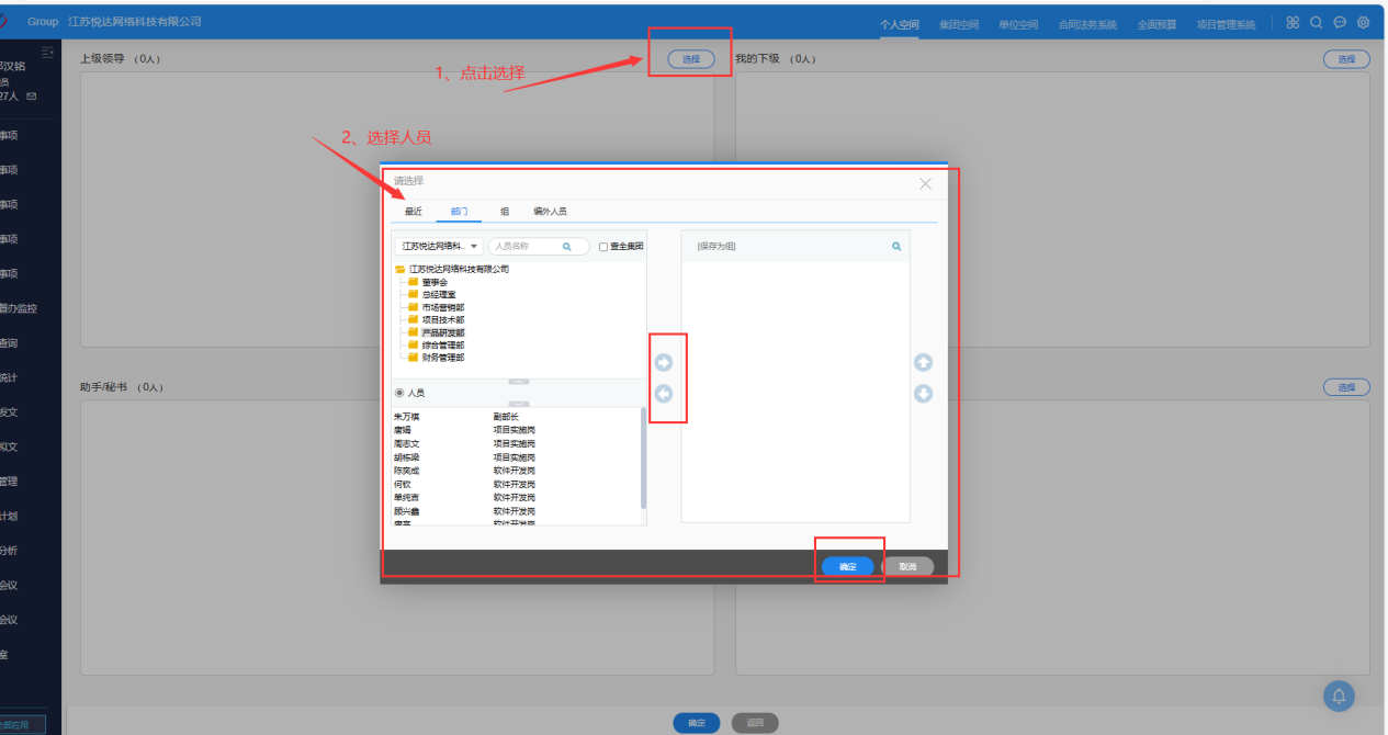 【关联人员设置】根据自己的项目部门,选择自己的领导或者下属。