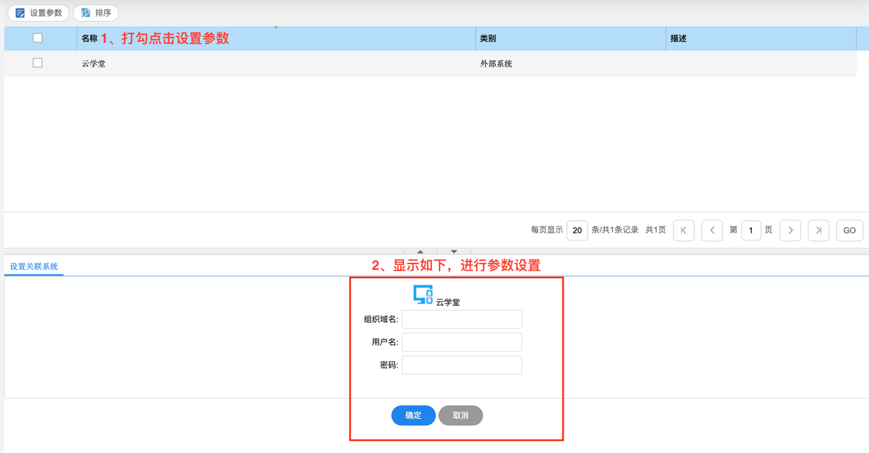 关联系统设置:目前可以关联的系统仅有云学堂,输入组织域名、用户密码点击确认按钮。