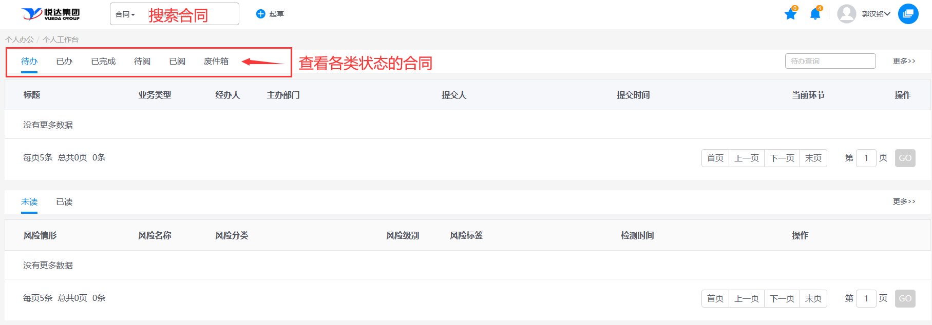 【步骤一】点击合同法务系统,进入系统。进入系统页面后,上方会显示待办、已办、已完成、待阅、已阅、废件箱等。