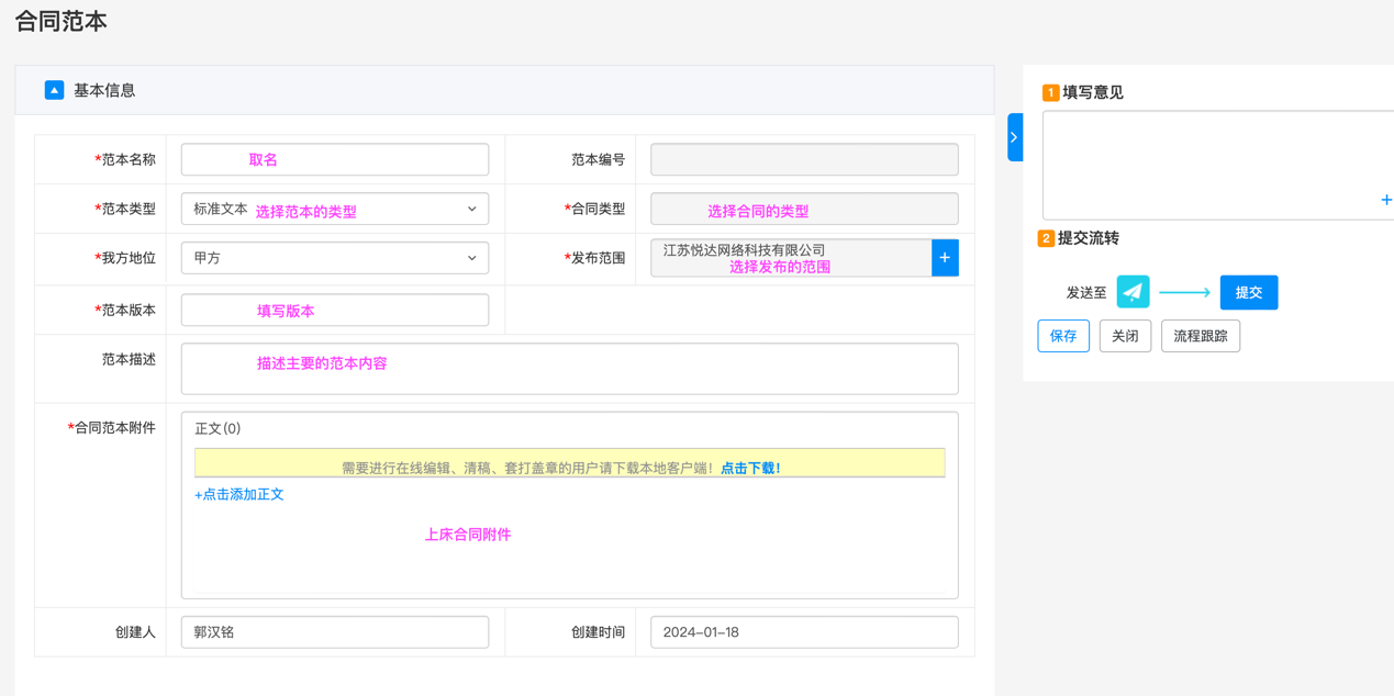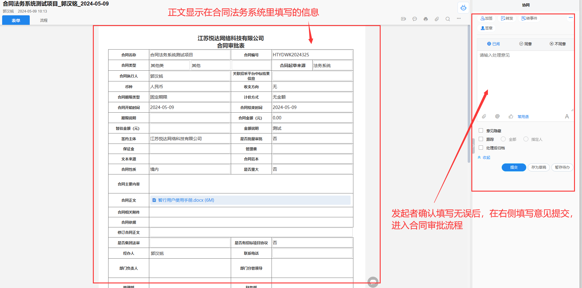 【步骤二】进入后,发起者对合同正文再次进行确认,无误后点击右边的提交按钮,进入合同的审批流程。