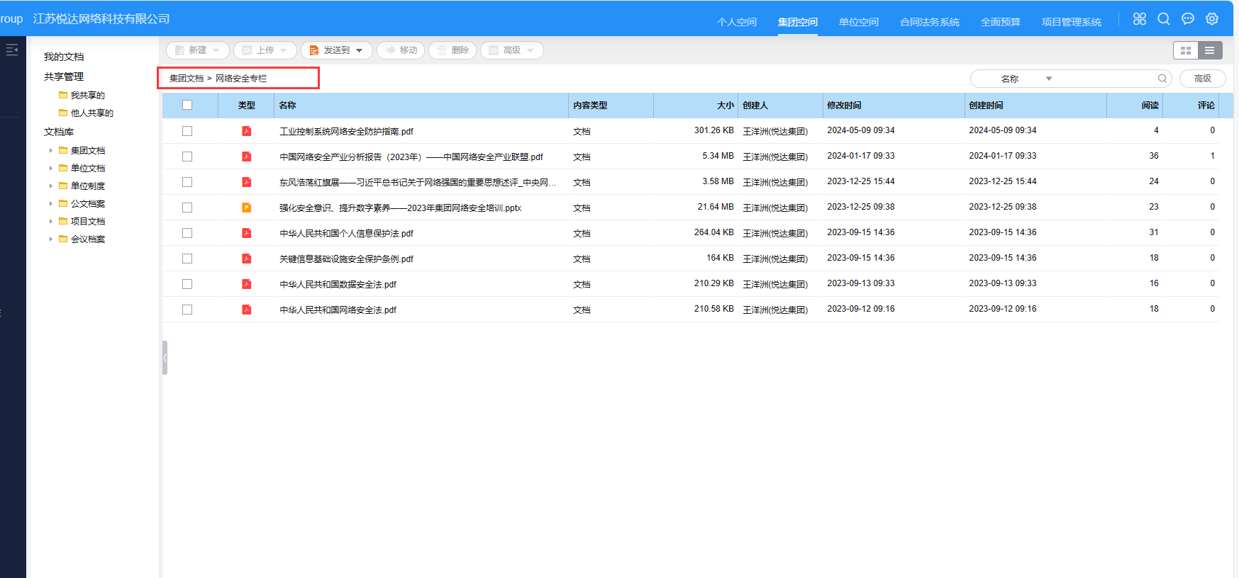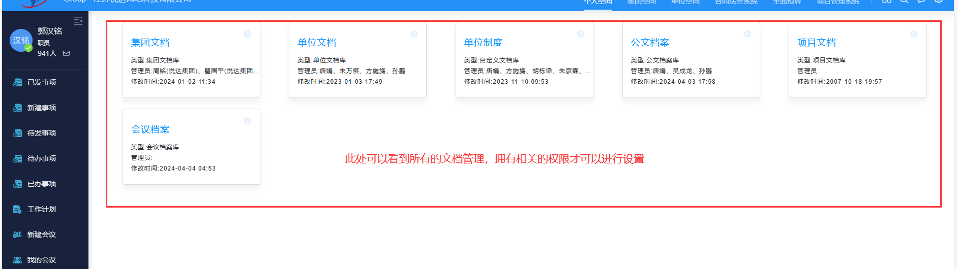 对应的文档库只有拥有授权的人才可以进行文档相关的操作权限。管理员可以对文档库进行新建删除的操作等,系统自带的集团文档,单位文档,公文文档是不能进行删除的。