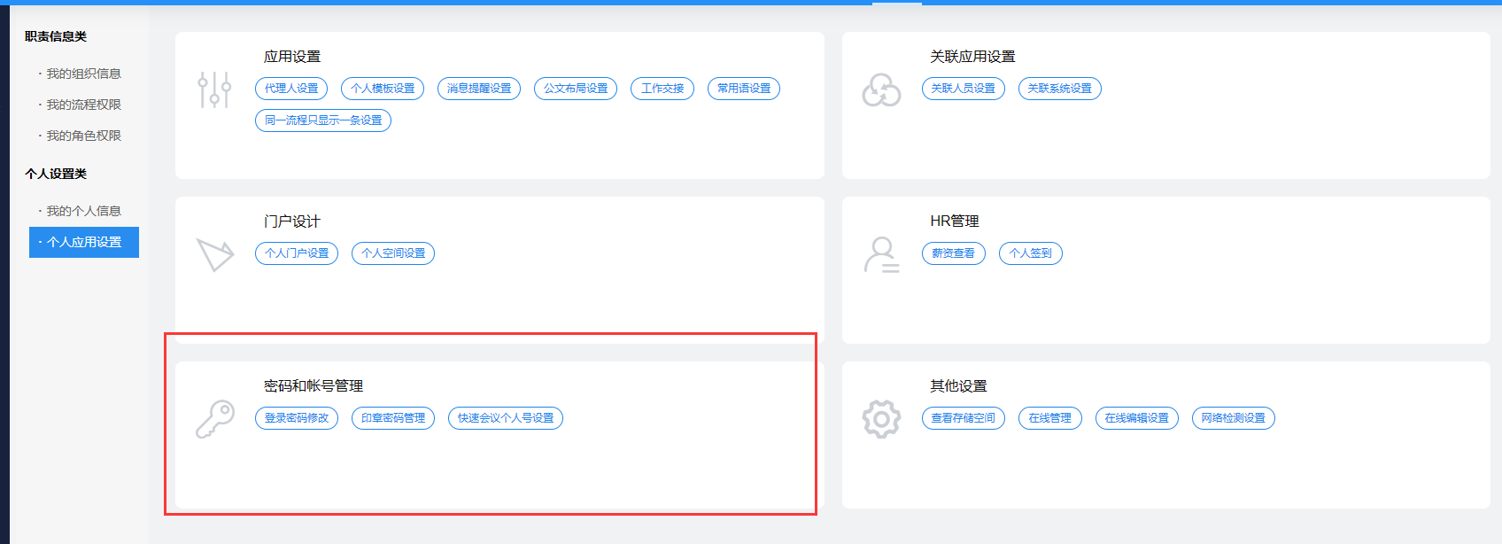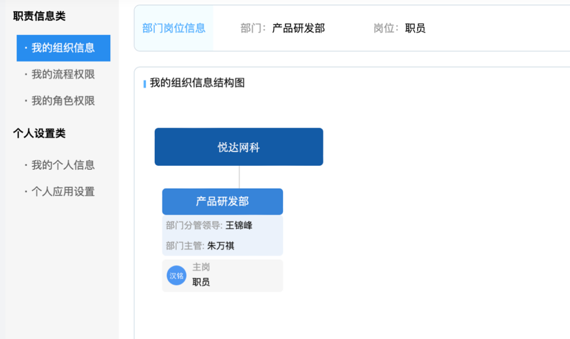 个人设置包括了我的组织信息、我拥有的流程权限、我的角色权限、我的个人信息、我的个人应用设置等,在此可以查看到自己的信息与权限。