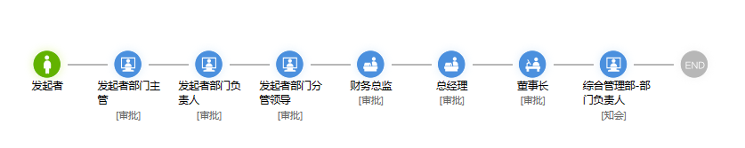 发起者填写事项 → 部门主管负责人审批/协同 → 部门分管领导 → 财务审批/知会 → 总经理 → 董事长
