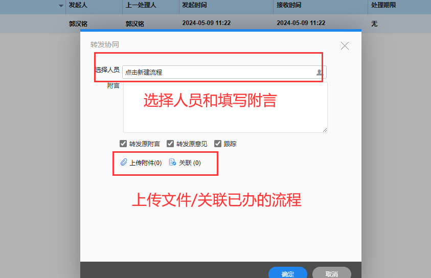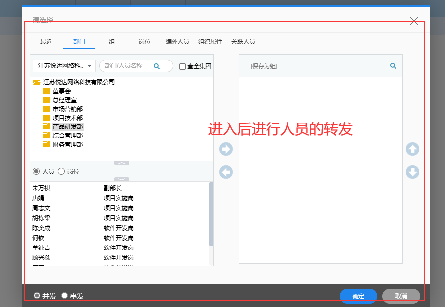 【步骤三】流程编辑: 如我们要将文件发送给朱万祺、周志文、胡栋梁,我们就在下方的人员选择框中,依次点击三个人的名字,再点击向右的箭头,进行人员的添加,反之点击选中的人员再点击向左的箭头则为删除。注意:框的最下方有一个选择 并发/串发 的选项,两种发送是不一样的效果,下方会解释。